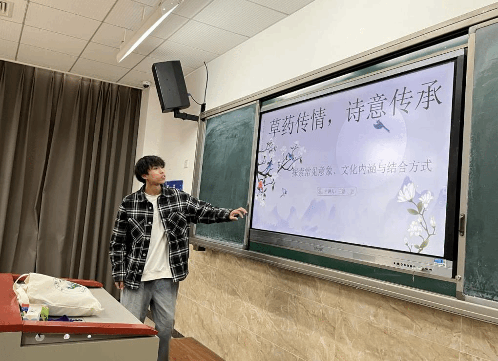 活动在主持人的精彩开场中拉开帷幕。她细致入微地介绍了中草药在古代诗词中的常见意象、深厚文化内涵以及中草药与诗词的巧妙结合方式,引领同学们步入了一个充满诗意与药香交织的殿堂。她强调,当古老的本草智慧邂逅灵动的诗词韵律,传统与青春在碰撞中擦出了耀眼的火花,我们不仅是在传承文化基因,更是在培育一种守护健康的文化自觉与责任感。