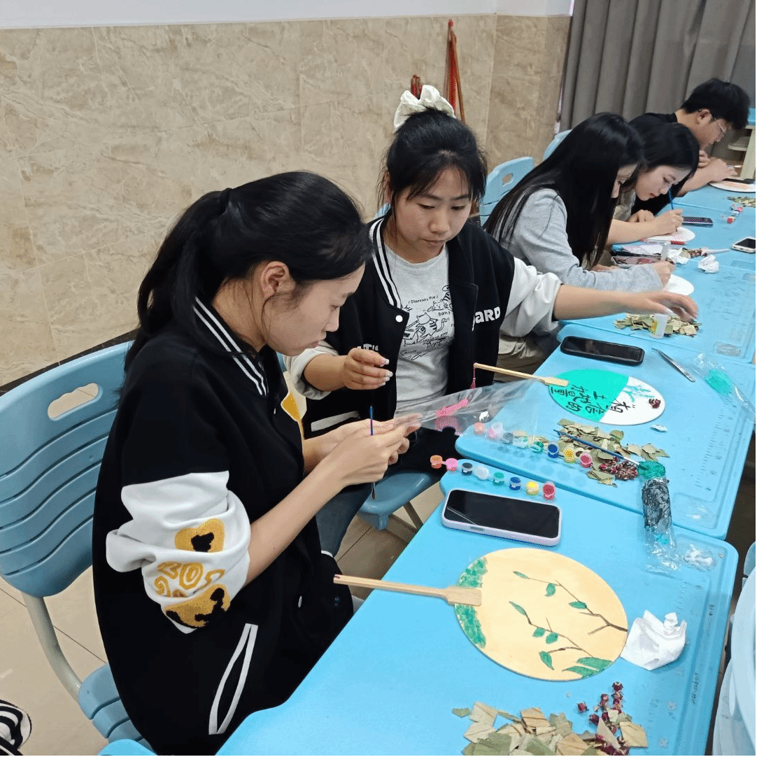 活动开始前,工作人员已备齐干玫瑰、荷叶等中药材及团扇、胶水等制作工具,并有序组织参与人员完成签到。活动过程中,主讲人黄靖带领参与人员走进小暑节气,为大家科普小暑节气的文化内涵及中草药的药用价值,如赏荷活动、食用苦味食物、避暑消夏活动等。在介绍避暑消夏活动时提到,小暑时节人们会制作或购买手工团扇,用以扇风纳凉,增添生活情趣。随后,在工作人员的指导与参与人员创新思维的运用下,大家将中药材创意拼贴于素面团扇之上。扇面制作过程中,参与人员全神贯注地装饰扇面,胶水的粘合、草药的排列、色彩的搭配,每一步都考验着耐心与审美。中药材本身的色彩与颜料相碰撞,成为别具风格的画卷,呈现在扇面之上。