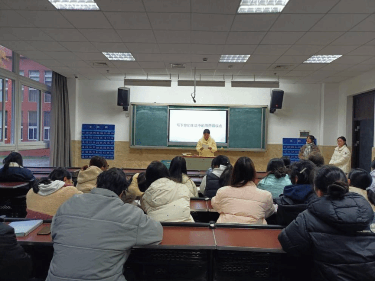 活动正式开展,主持人首先阐明宗旨,强调本次活动旨在帮助同学们树立科学用药意识、掌握正确用药知识、规避用药误区,切实提升其规范用药能力与风险规避素养。随后陈曦老师以“什么是药”的问题引发全场思考,进而自然引出“安全用药”的活动主题,同学们对此活动主题展开思考讨论,活动氛围积极热烈。接着进入互动分享环节,同学们踊跃登台,结合自身或身边的经历分享日常生活中的错误用药案例。分享结束后,主持人紧扣活动主题,现场呈现“咳嗽盲目服用抗生素”“擅自加倍止痛药剂量”“中药西药随意同服”三段典型错误用药情景,并逐一精准指出错误要点,让同学们深刻认知用药误区的危害与规避方法。