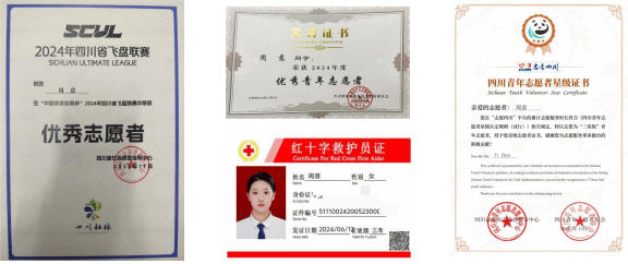志愿服务是青春里最鲜明的底色。自入学以来,她始终秉持青协八字方针“奉献、友爱、互助、进步”的志愿精神,积极投身各类志愿活动,累计志愿时长717.7小时,为四川“三星级”青年志愿者。从学校志愿到社会公益,见证着她将青春热血融入社会服务的点滴付出。此外,她还考取红十字救护员证,以专业的急救知识为志愿服务增添硬核力量,用实际行动诠释着青年学子的社会责任感。