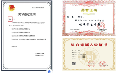校园实践与综合素质的全面发展,是周意成长的另一重要维度。她所带领的《随药随到,智慧助老》项目在sunbet申搏官方网站暑期“三下乡”社会实践中荣获“优秀团队”,将专业知识与助老公益相结合,探索出医药专业服务社会的新路径;参与“返家乡”社会实践获得实习单位的高度认可;担任学院团委副书记期间,凭借出色的综合表现,获评年度“先锋学生干部”等,并获评国家奖学金、四川省大学生综合素质A级证书等,成为学院学子德智体美劳全面发展的典范。在日常学习与工作中,她以优秀学生干部的身份以身作则,把思想引领的要求落到实处,成为学院思政教育与专业教育融合的优秀践行者。