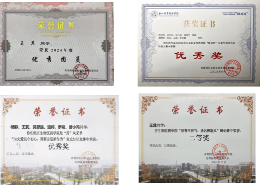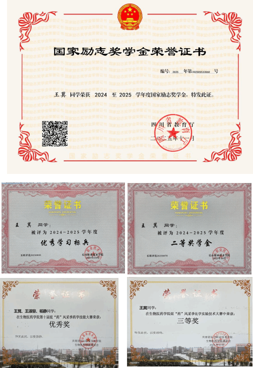 “立身以立学为先,立学以读书为本。”作为药学专业学生,她始终将专业学习放在首位,着力构建系统化知识体系,注重理论与实践的深度融合。课堂上,她专注钻研药理知识与实验技能;课后,她常常泡在实验室反复打磨操作细节。在“炫‘药’风采季”系列竞赛中,凭借扎实的专业功底,她成功斩获化学实验技术大赛三等奖与药学技能大赛优秀奖。这份深耕细作让她收获了学年90.86分的专业第一成绩,先后获评2024-2025年度“优秀学习标兵”、二等奖学金及国家励志奖学金,用实力印证了“技精于勤”的真理。同时,她考取了普通话二甲证书,不断提升综合素养,为未来职业发展夯实基础。