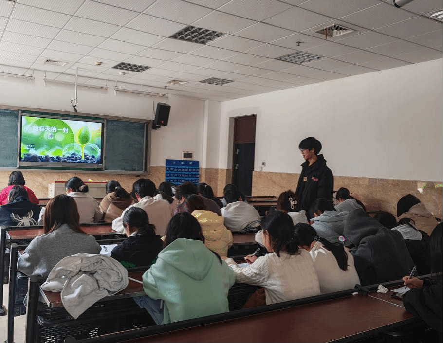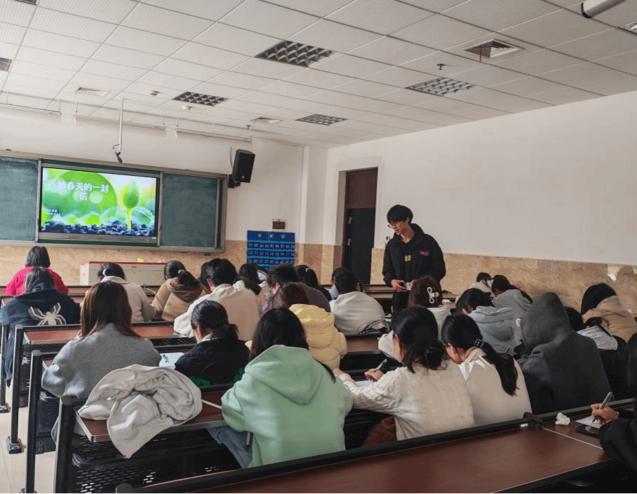 活动伊始,主讲人围绕活动主题进行现场引导,结合春日自然风貌分享感悟与书写思路,屏幕上春意盎然的画面与温柔的讲解相融,让现场氛围愈发温馨。同学们认真聆听,细心地记录下每一个关键要点,在讲解中努力探寻着属于自己的创作灵感。