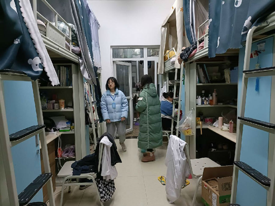 此次检查重点是宿舍地面清扫、个人物品摆放、衣物晾晒和桌面擦拭,同时进行安全隐患排查。整个检查过程进展顺利,执勤人员认真负责,同学们积极配合,卫生整体良好,室内通风良好,无违规使用电器现象,对排查出的安全隐患及个别宿舍脏乱的现象做了详细记录,便于下一步拉单列表对照整改。