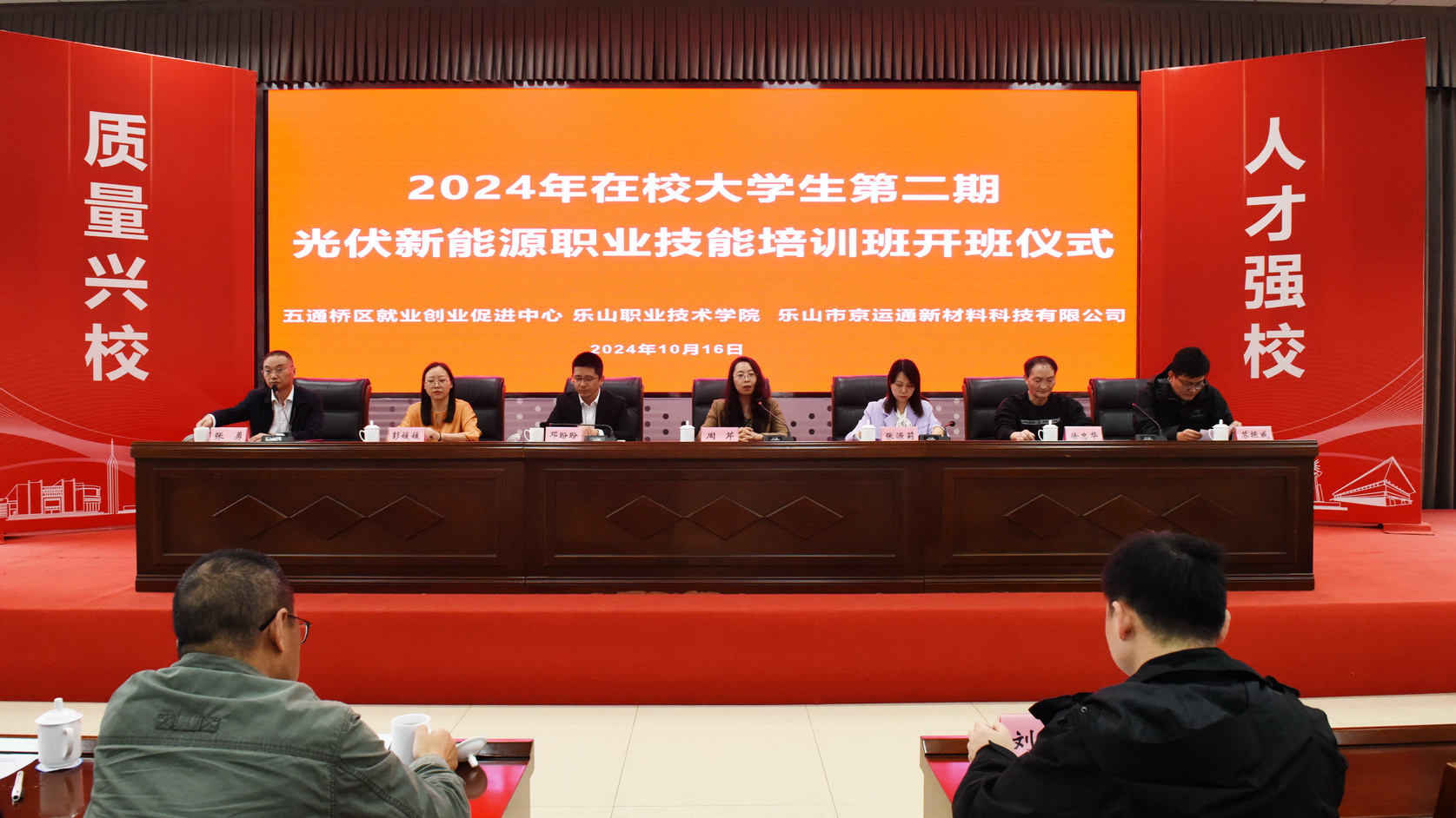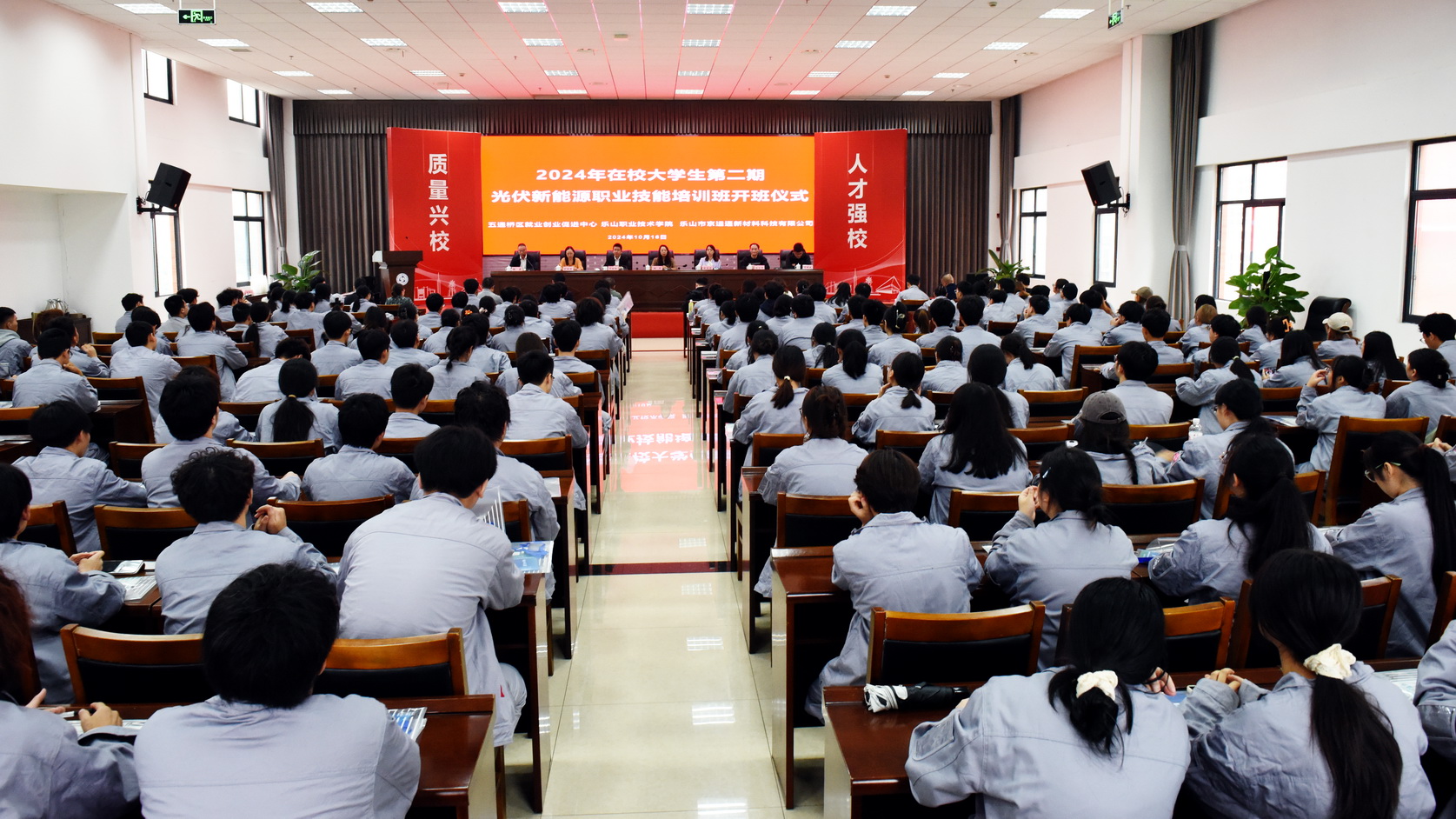 2024年10月16日,sunbet申搏官方网站2024年在校大学生第二期光伏新能源职业技能培训开班仪式在学术交流中心3004会议厅举行。学校党委委员、副校长周芹,五通桥区就业创业促进中心主任张源莉出席开班仪式并讲话。乐山市京运通新材料科技有限公司相关领导,学校继续教育学院和新能源与材料学院相关负责人,200余名师生参加开班仪式。