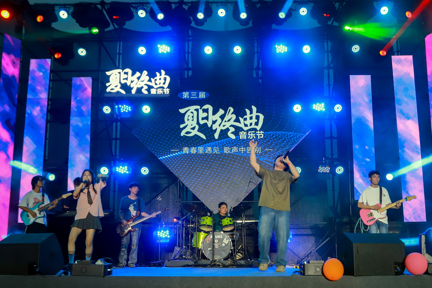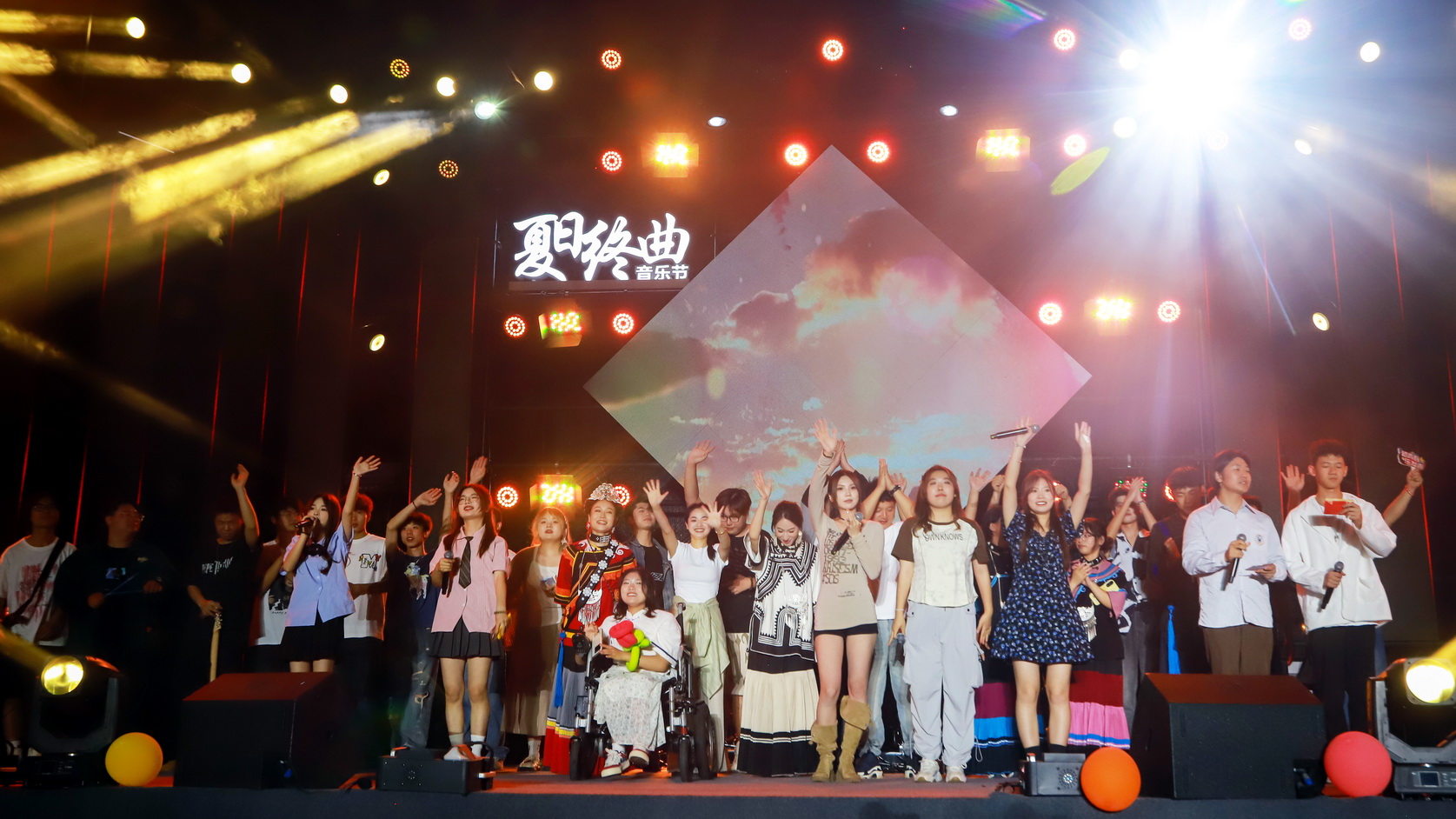 夏日的微风吹起同学们的热情与期待,流光溢彩的舞台承载着爱与希望,激情澎湃的音乐升腾着希望和梦想。音乐节上,大三学生和往届学长、学姐激情参演,老师组成神秘嘉宾用歌唱、舞姿献礼,引来现场一阵阵热烈的欢呼声。