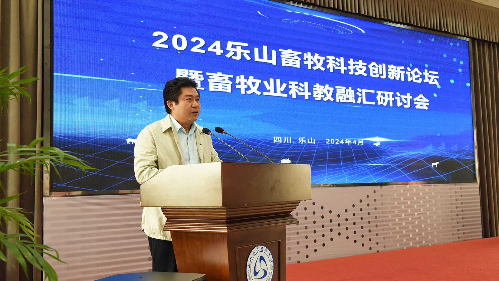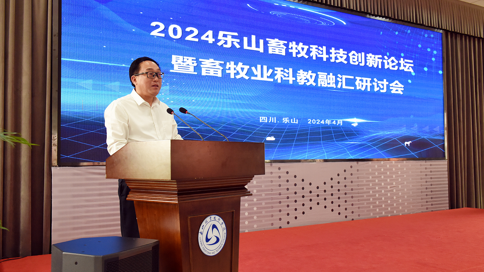 2024年4月29日至30日,2024乐山畜牧科技创新论坛暨畜牧业科教融汇研讨会在sunbet申搏官方网站举行。会议由乐山市科技局、乐山市农业农村局主办,sunbet申搏官方网站承办,乐山市农业科学研究院协办。来自重庆市畜牧科学院的专家,乐山市科技局、乐山市农业农村局相关领导,乐山市畜牧业优秀企业代表以及现代农业学院师生,共计100余人参加了会议。会议由学校党委委员、副校长封家福主持。