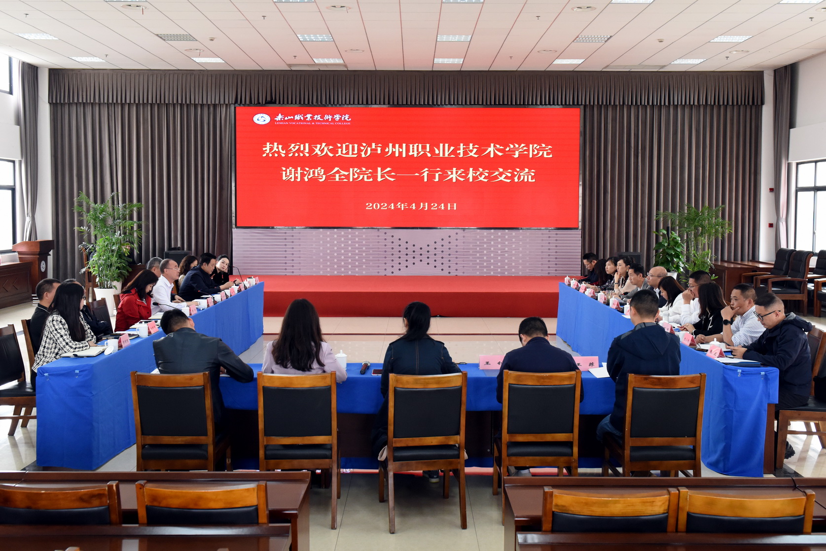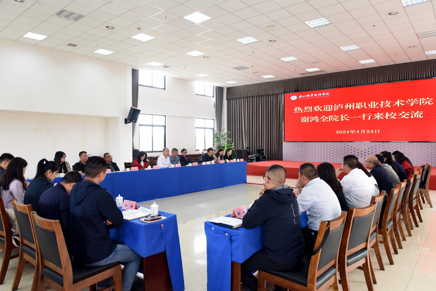 4月24日上午,泸州职业技术学院党委副书记、院长谢鸿全一行来学校调研交流,交流座谈会在学术报告厅3004会议室举行。学校校长刘忠,纪委书记李昌贵及相关部门和二级学院负责人参加座谈会。