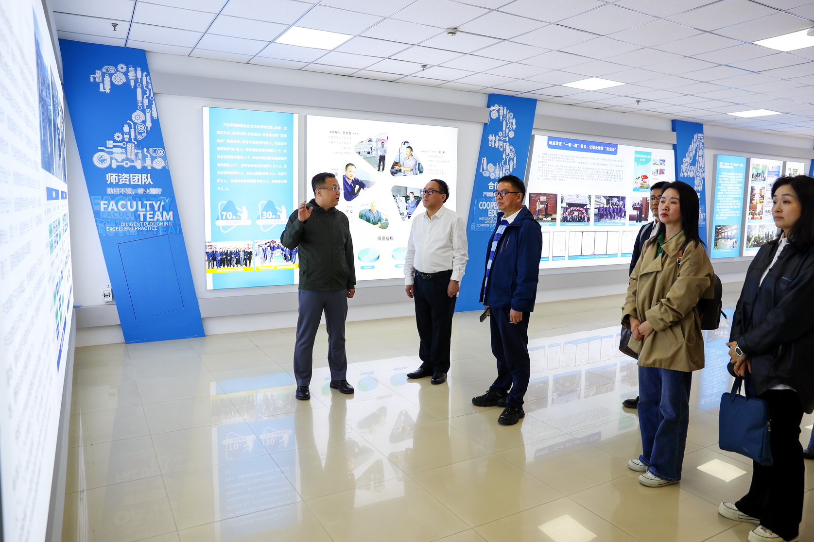 座谈会后,在王军的陪同下,成定彬一行参观了汽车学院的产教融合实训基地,包括汽车维修服务技术、新能源汽车技术、智能网联汽车技术等前沿领域,深入了解实践教学和校企合作模式。