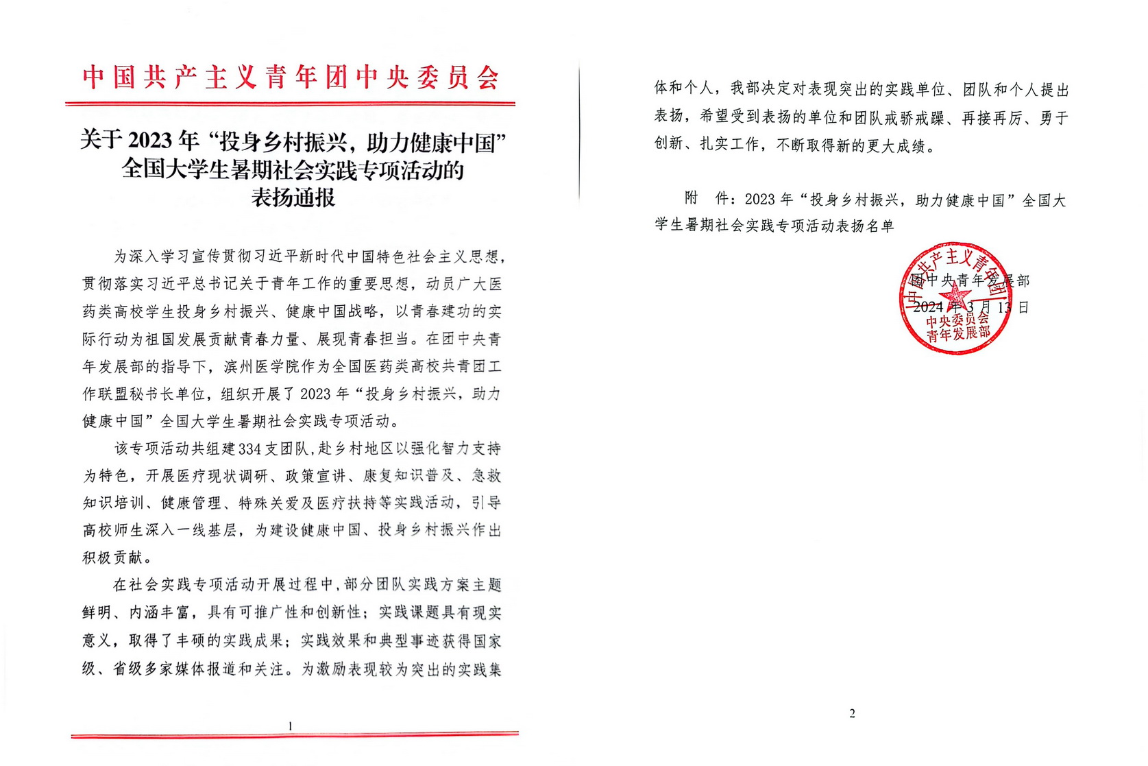 2024年3月13日,共青团中央青年发展部通报了2023年“投身乡村振兴,助力健康中国”全国大学生暑期社会实践专项活动表扬名单。sunbet申搏官方网站学生段梦被评为此次暑期社会实践专项活动表现突出个人。