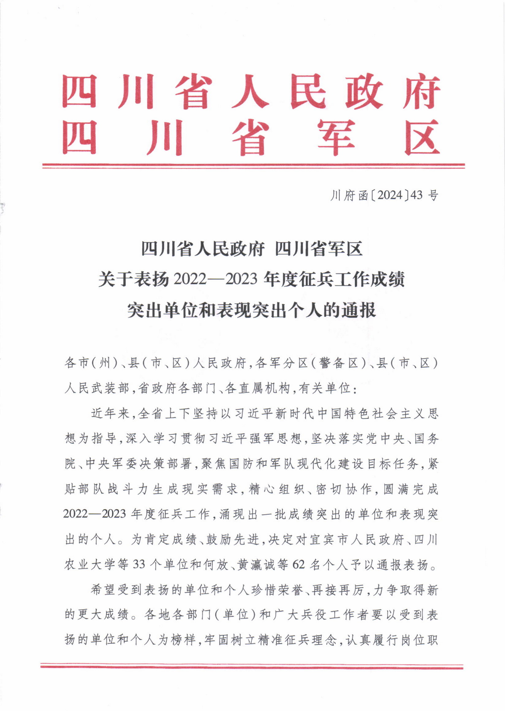 近日,四川省人民政府、四川省军区发布《关于表扬2022—2023年度征兵成绩突出单位和表现突出个人的通报》,申搏官网荣获全省大学生征兵工作成绩突出单位。
