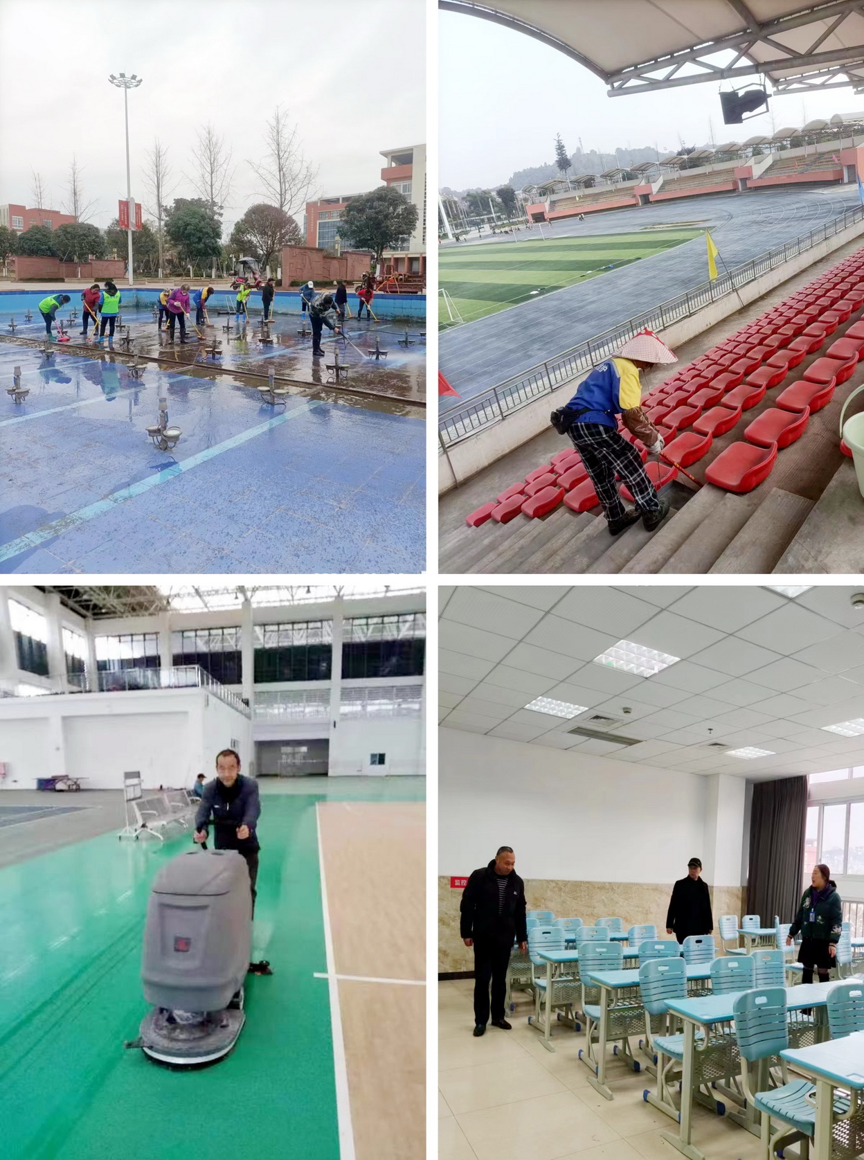 组织保洁人员对教学楼、办公楼、体育场馆、观景水池等校园公共场所及重点区域进行了全方位清扫,保证清洁卫生无死角,营造干净整洁的校园环境。