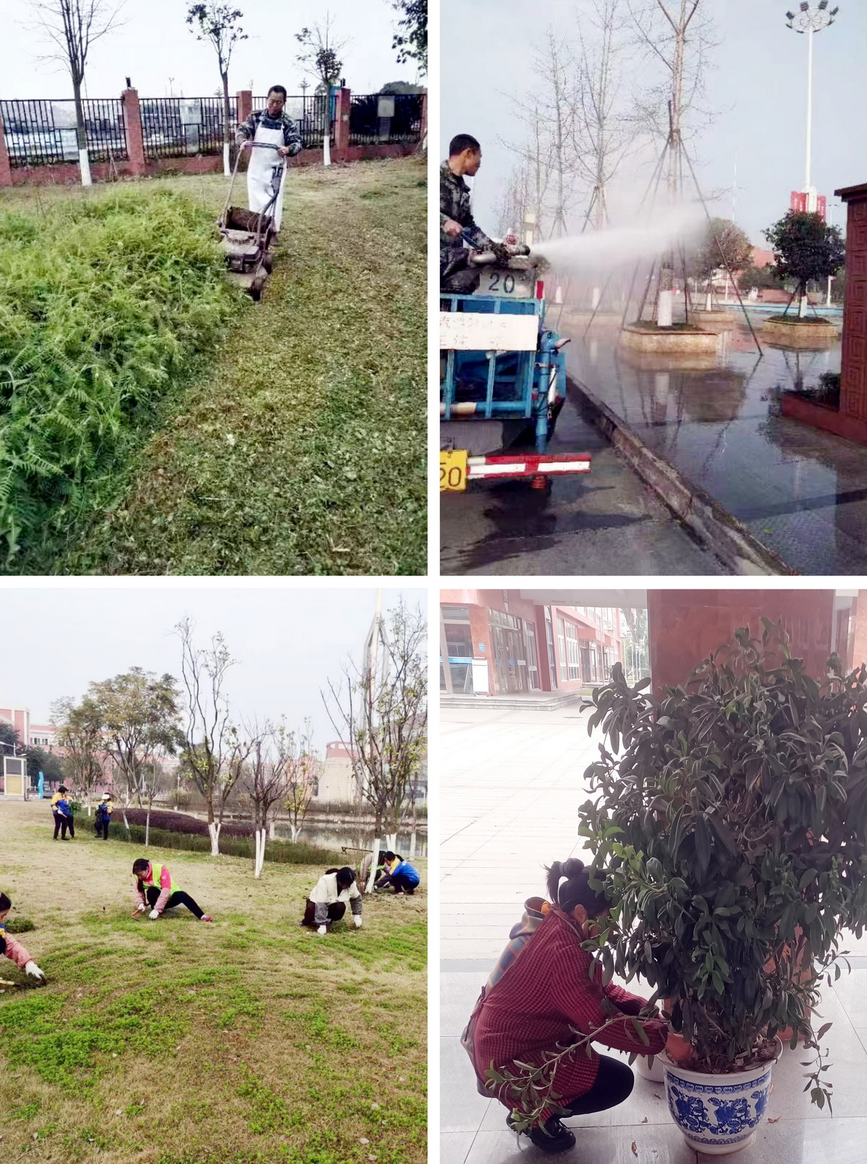 组织绿化人员对校园进行绿化修剪、浇水除草清理危树枯枝,美化绿色校园,打造美丽校园。