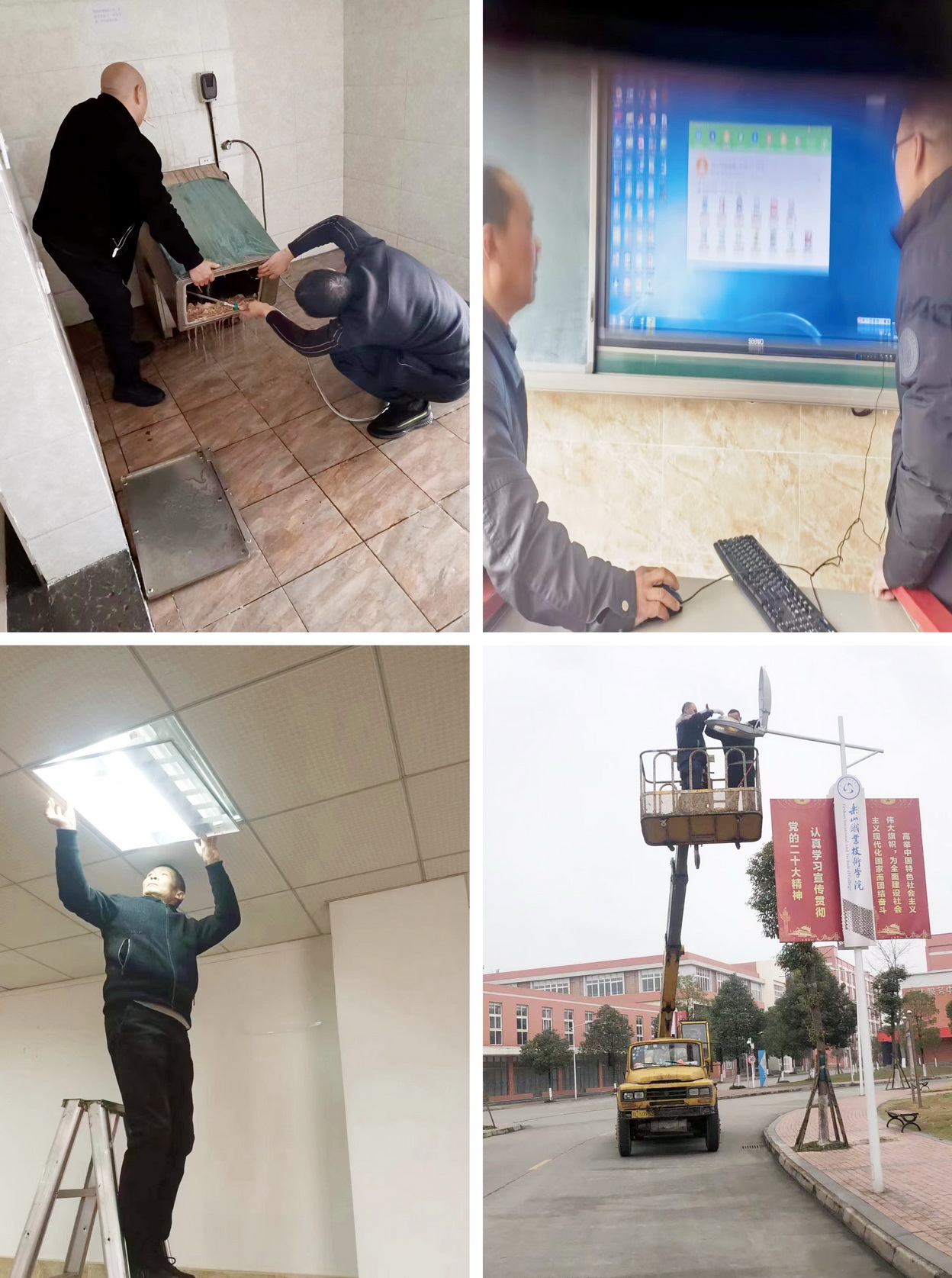 后勤处还组织检查并维修维护校园建筑物及道路(瓷砖掉落、墙体裂缝、路面破损等),对电梯、高压配电设备进行维护保养,联系燃气公司对学校燃气安全使用做全面检查等工作。
