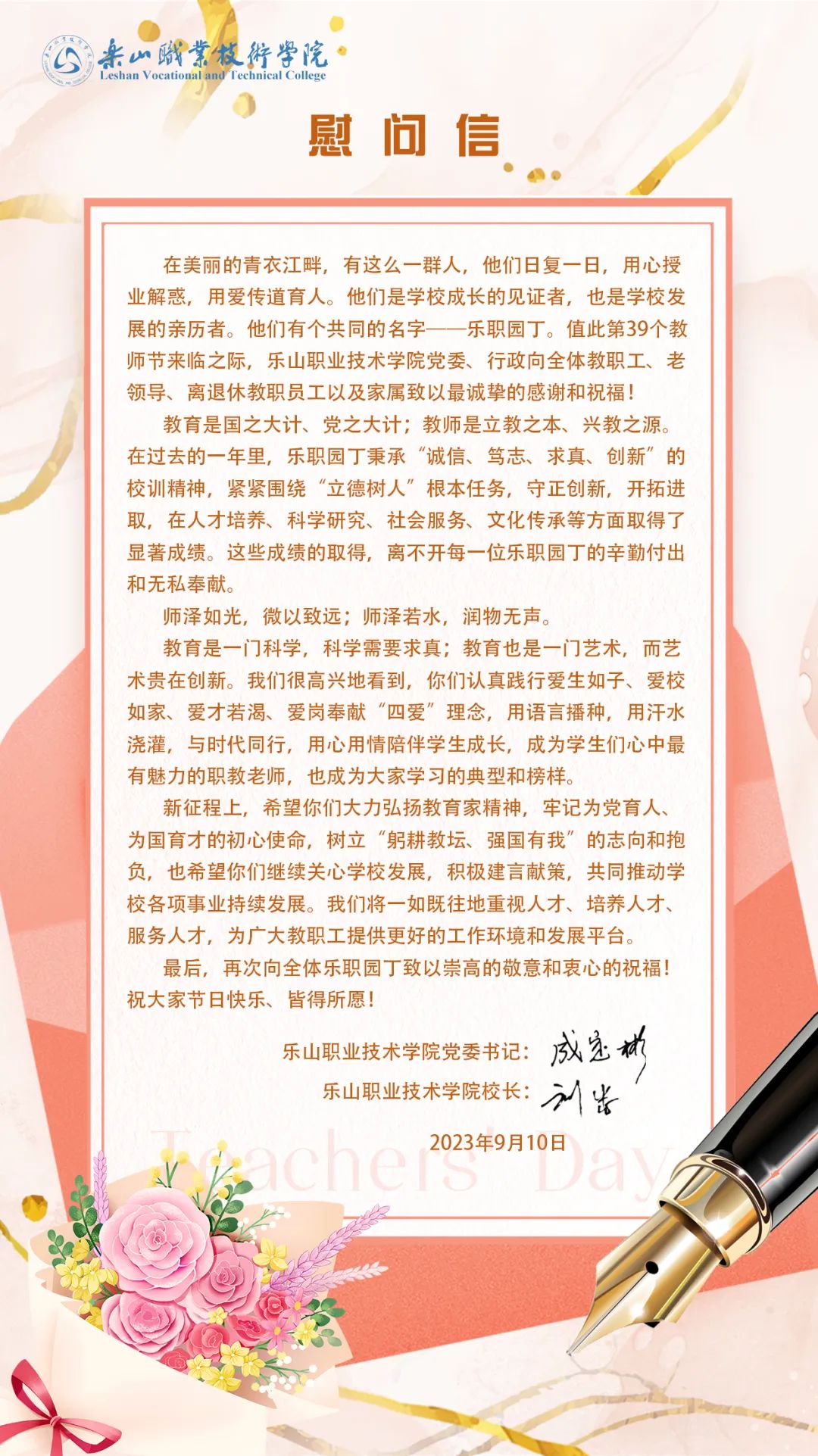 在美丽的青衣江畔,有这么一群人,他们日复一日,用心授业解惑,用爱传道育人。他们是学校成长的见证者,也是学校发展的亲历者。他们有个共同的名字——乐职园丁。值此第39个教师节来临之际,sunbet申搏官方网站党委、行政向全体教职工、老领导、离退休教职员工以及家属致以最诚挚的感谢和祝福!