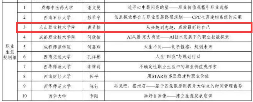 近日,由四川省教育厅、四川省人力资源和社会保障厅主办,四川省高校学生信息咨询与就业指导中心等单位联合承办的“四川省2023年高校就业创业指导金课”评选活动落下帷幕,申搏官网杨鸿辅导员名师工作室成员曹呈楠老师参评课程《从兴趣到志趣,成就最好的自己》在全省208门课程中脱颖而出,以第三名的成绩入选职业生涯规划组金课。