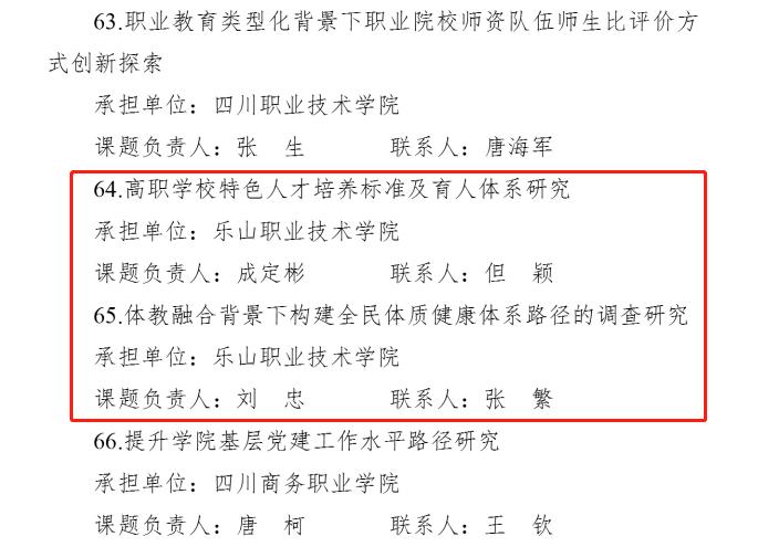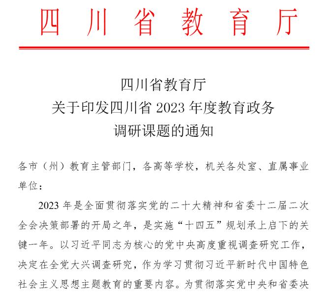 近日,学校收到《四川省教育厅关于印发四川省2023年度教育政务调研课题的通知》,通知显示sunbet申搏官方网站申报的《高职学校特色人才培养标准及育人体系研究》《体教融合背景下构建全民体质健康体系路径的调查研究》2项课题,成功入选四川省2023年度教育政务调研课题。