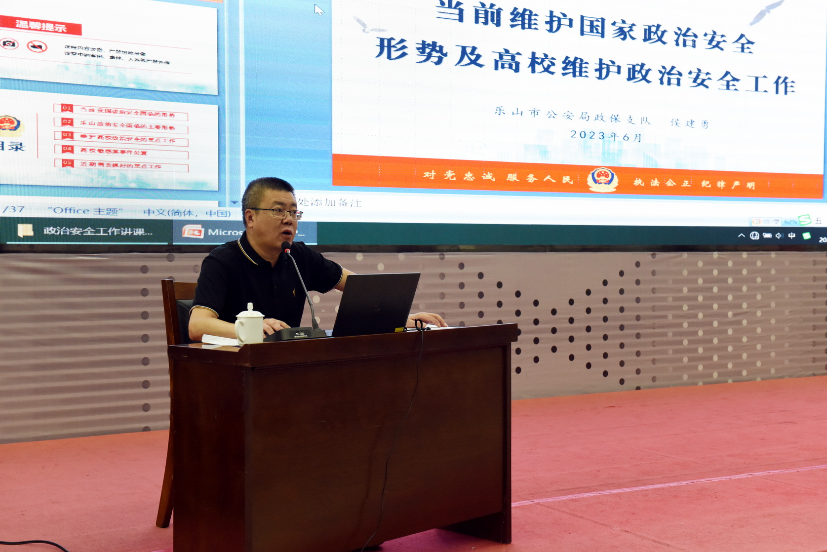 为增强学校中层干部政治意识,提升学校政治安全管理水平,全面筑牢政治安全防线,确保学校安全稳定。6月16日上午,乐山市公安局政保支队侯建勇同志应邀在学术交流中心3004会议室对全体中层干部进行政治安全培训,培训会由学校党委委员、副校长封家福主持。