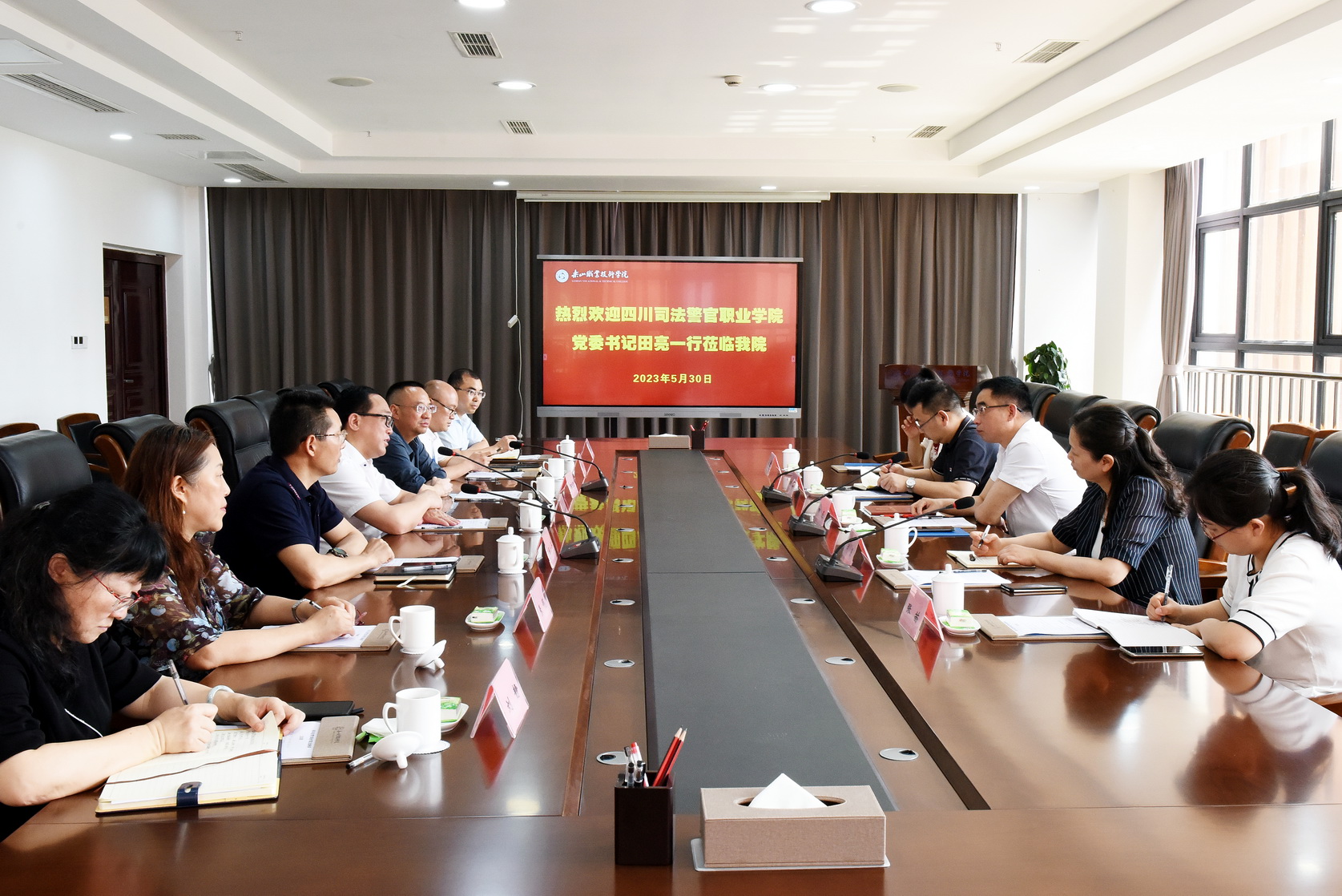 2023年5月30日上午,四川司法警官职业学院党委书记田亮,党委委员、副院长胡蓉及招生就业处相关人员一行5人莅临sunbet申搏官方网站考察交流。交流座谈会在学术交流中心2001会议室进行,sunbet申搏官方网站党委书记成定彬,党委委员、副校长陈元进,后勤处、学生工作部相关负责人参加了交流座谈会。