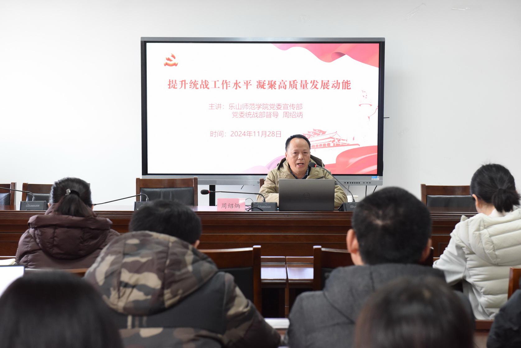 11月28日下午,2024年sunbet申搏官方网站统战工作培训会在401会议室举行,学校党委统战部邀请乐山师范学院统战部督察员周绍炳作专题培训。学校统战工作领导小组成员单位负责人,二级学院统战委员参加培训。