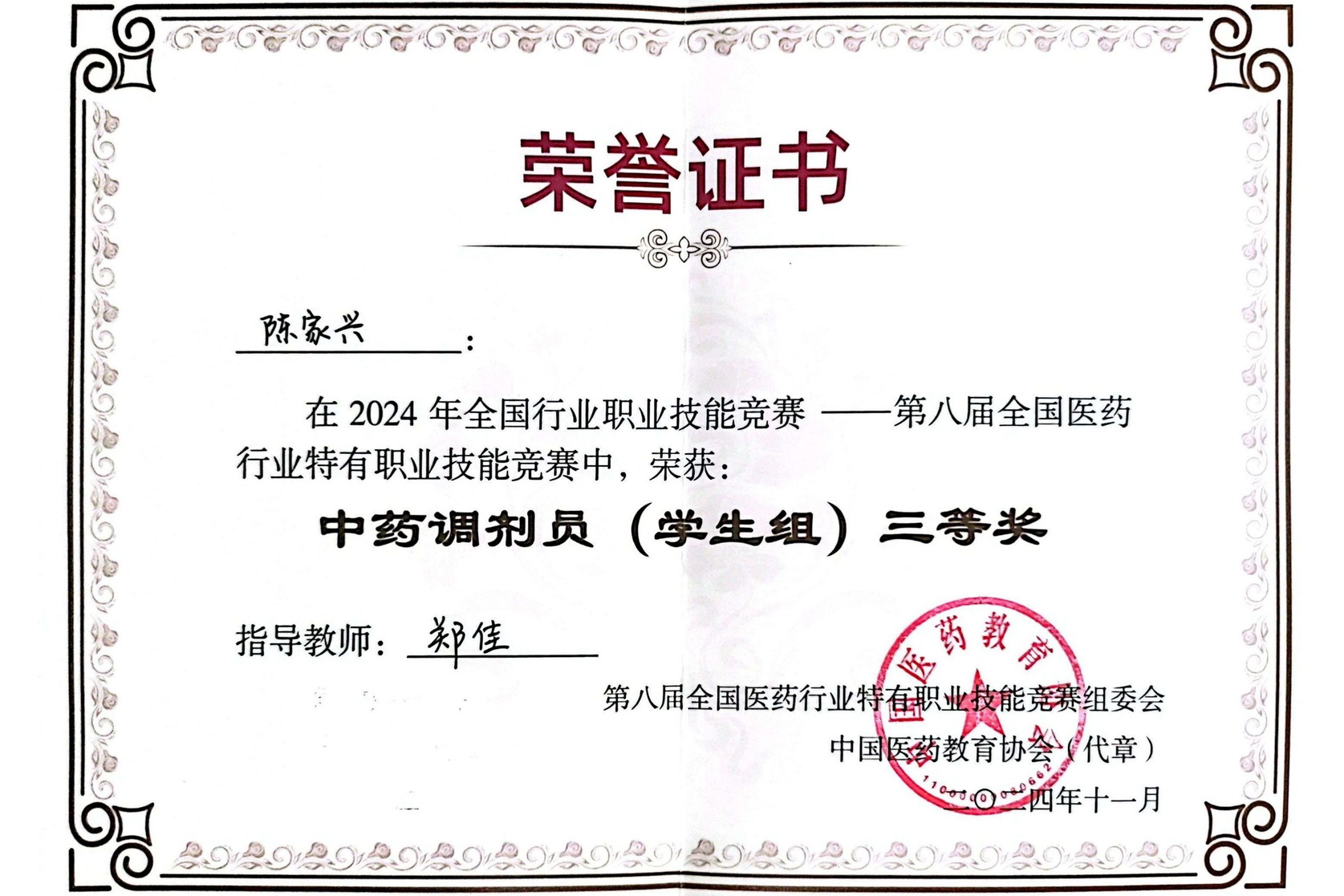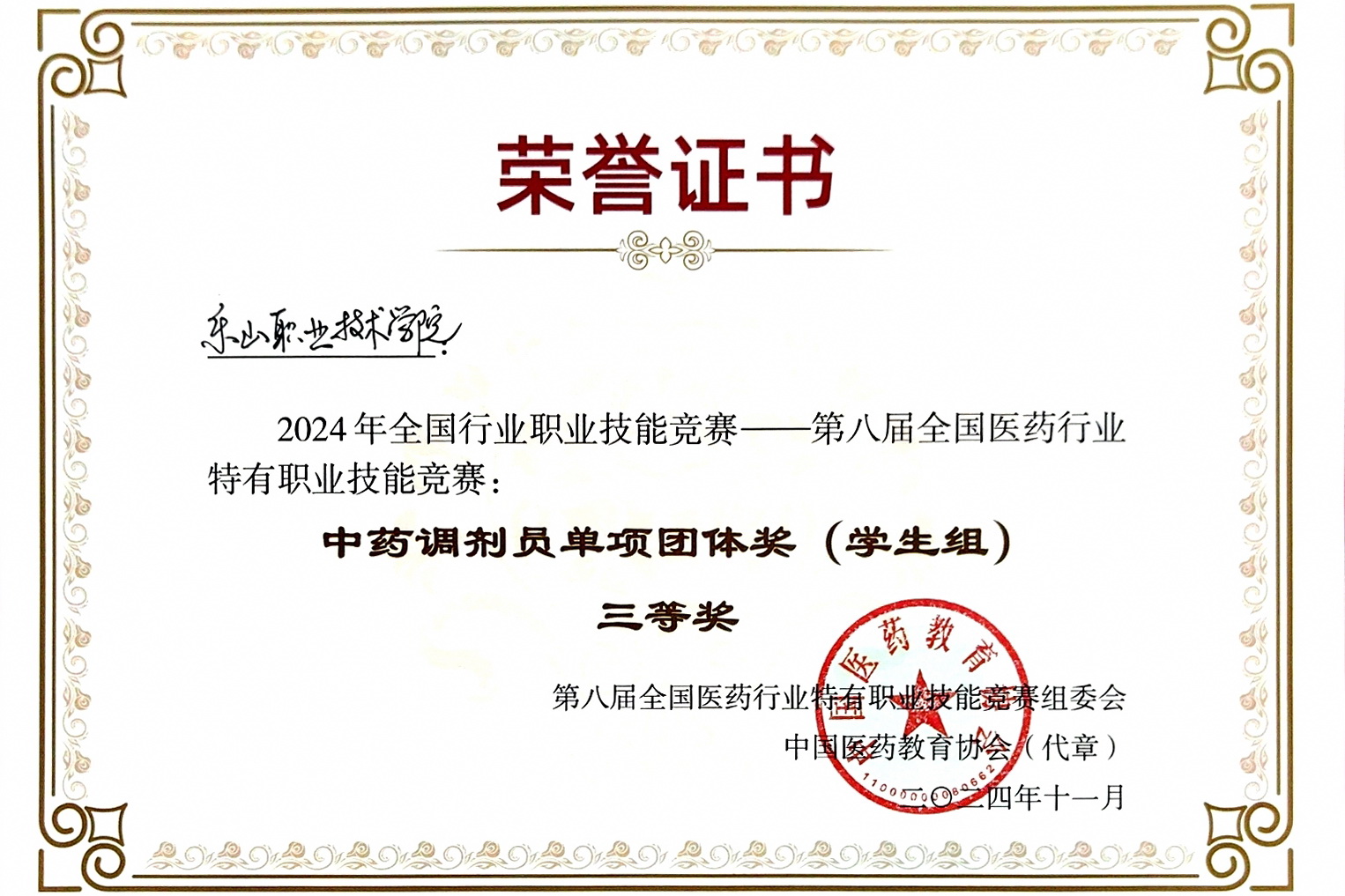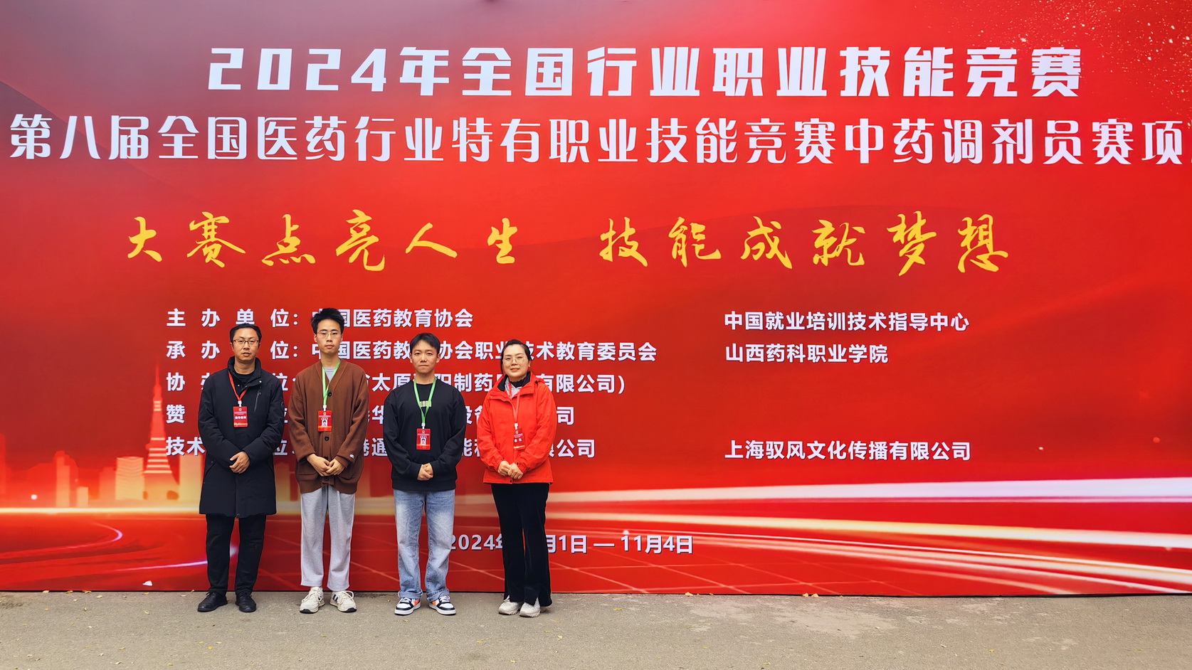 11月1日至3日,2024年全国行业职业技能竞赛——第八届全国医药行业特有职业技能《中药调剂员》赛项决赛在山西药科职业学院举行。来自全国61所高校的122名学子同台竞技、同场切磋。经过一番激烈的角逐,sunbet申搏官方网站生物医药学院教师郑佳、张俊指导的中药学专业学生陈家兴、朱灿团队荣获中药调剂员单项团体奖(学生组)三等奖,陈家兴获中药调剂员(学生组)个人三等奖,朱灿获优胜奖。
