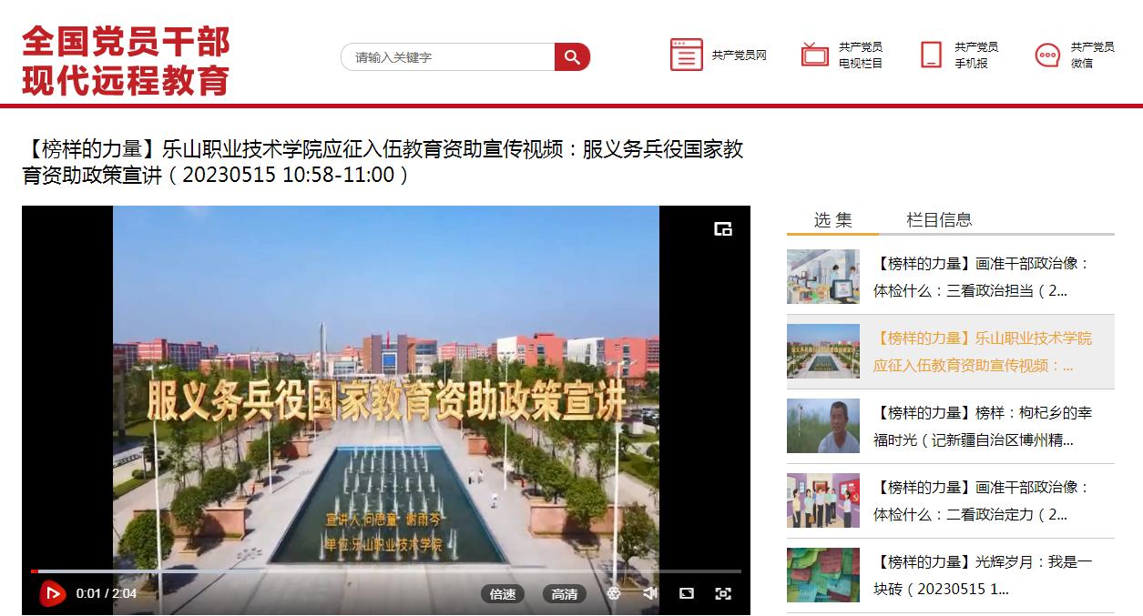 中组部“共产党员网”全国党员干部远程教育榜样的力量专栏,播出了学院制作的应征入伍教育资助宣传视频《服义务兵役国家教育资助政策宣讲》。