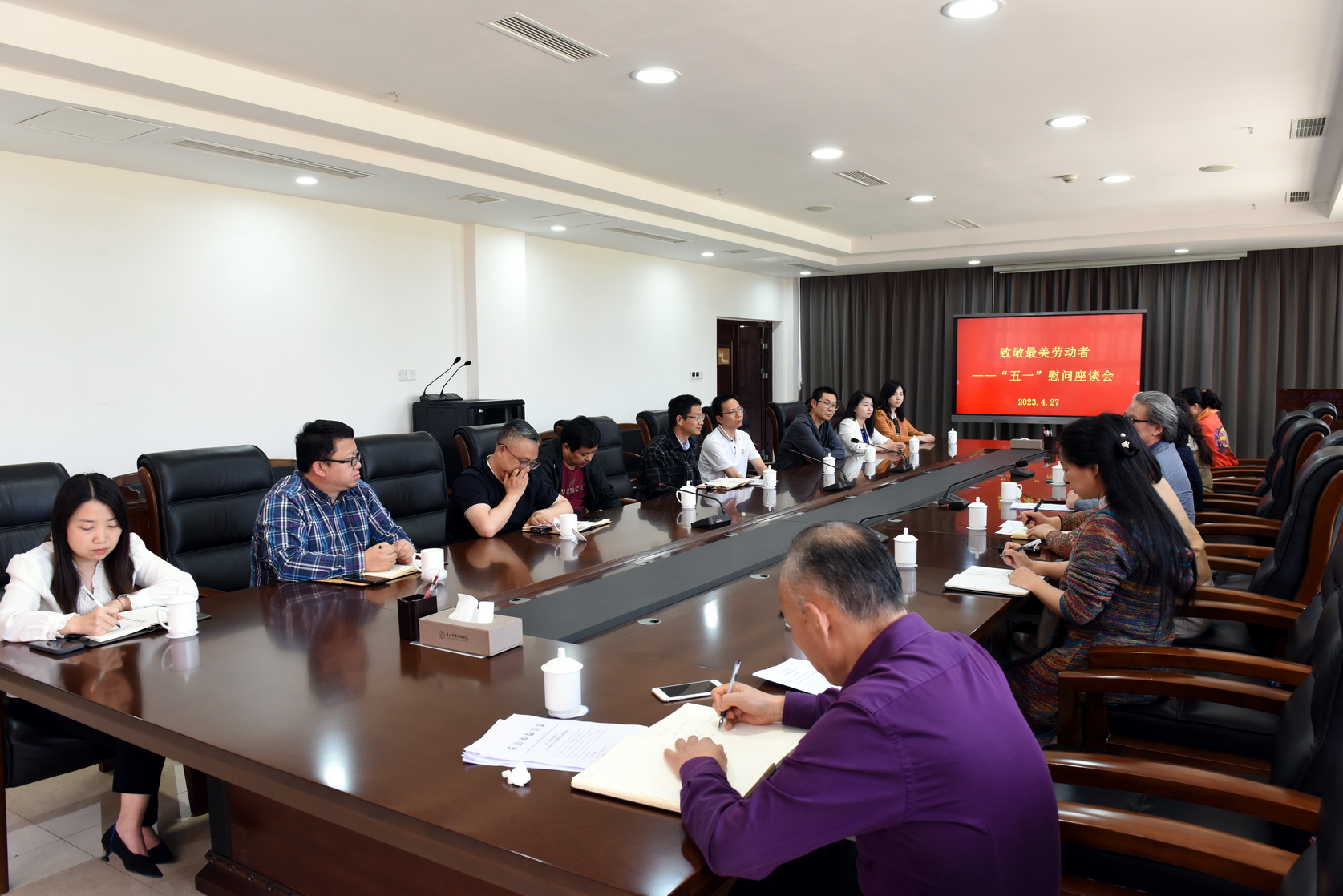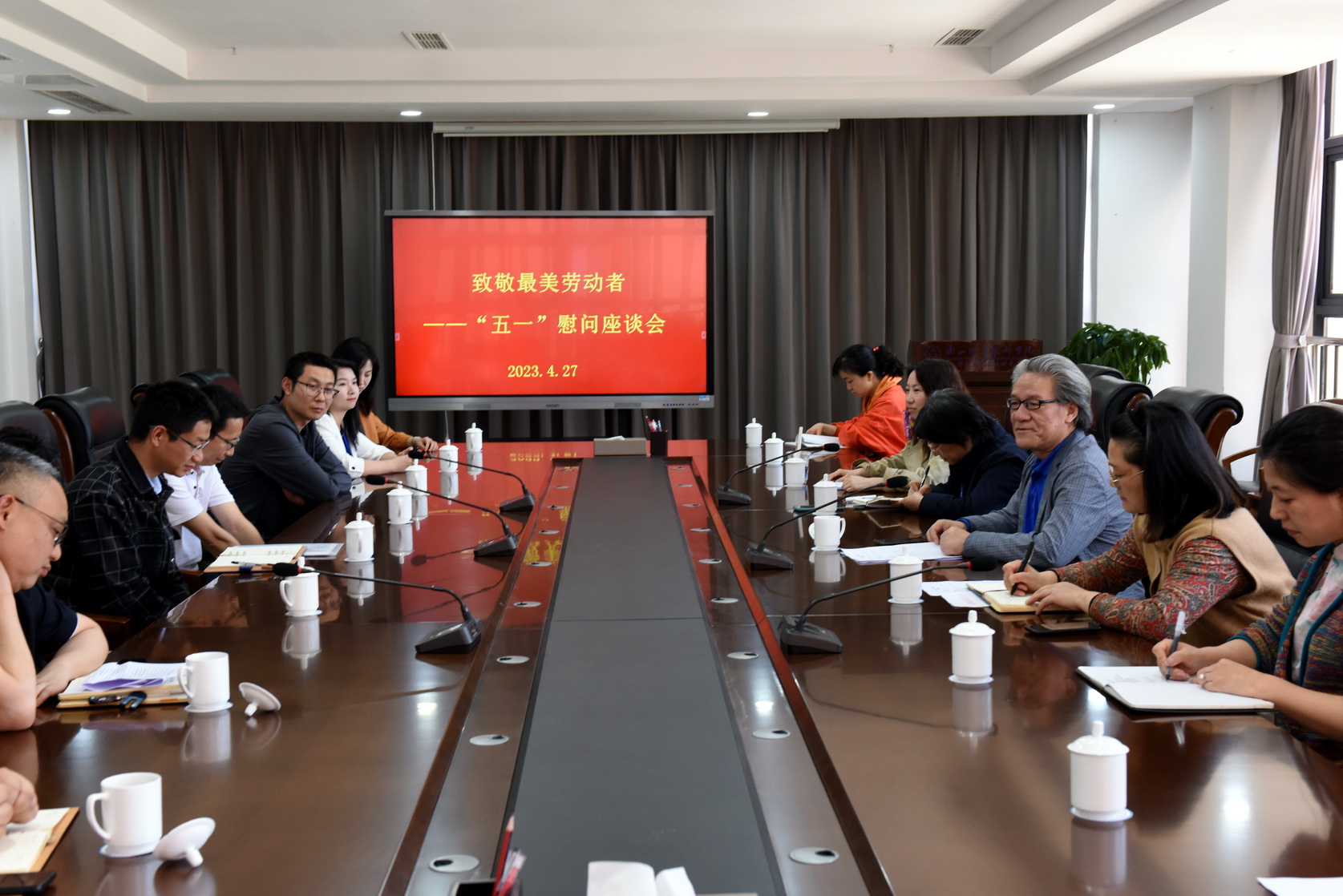 4月27日下午,为庆祝“五一”国际劳动节的到来,学校工会在学术交流中心2001会议室组织召开“五一”慰问座谈会,校党委副书记、工会主席陈芝海出席并讲话,学校省市劳模、三八红旗手、工匠大师、技能大师、“五一”巾帼标兵、乐山工匠、市优秀教育工作者、市优秀教师、省市创新工作室负责人、2022年四川省教师教学能力大赛团队负责人代表等共20余人参会。座谈会由工会副主席黄晓莉主持。