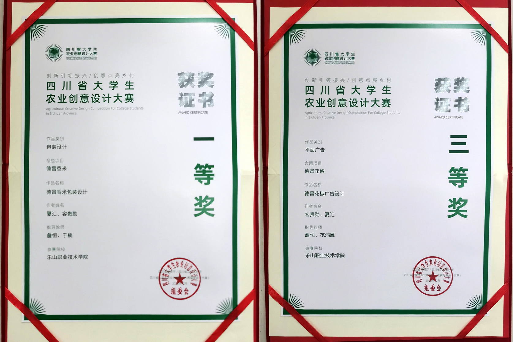本次大赛吸引了全国95所高校近6000名在校学生参赛角逐,由文化旅游学院老师詹恒、于楠指导,2021级影视动画专业学生夏汇、容贵勋创作的《德昌香米包装设计》获得一等奖;詹恒、范鸿雁老师指导,容贵勋、夏汇创作的《德昌花椒广告设计》获三等奖;詹恒、于楠获优秀指导教师奖。