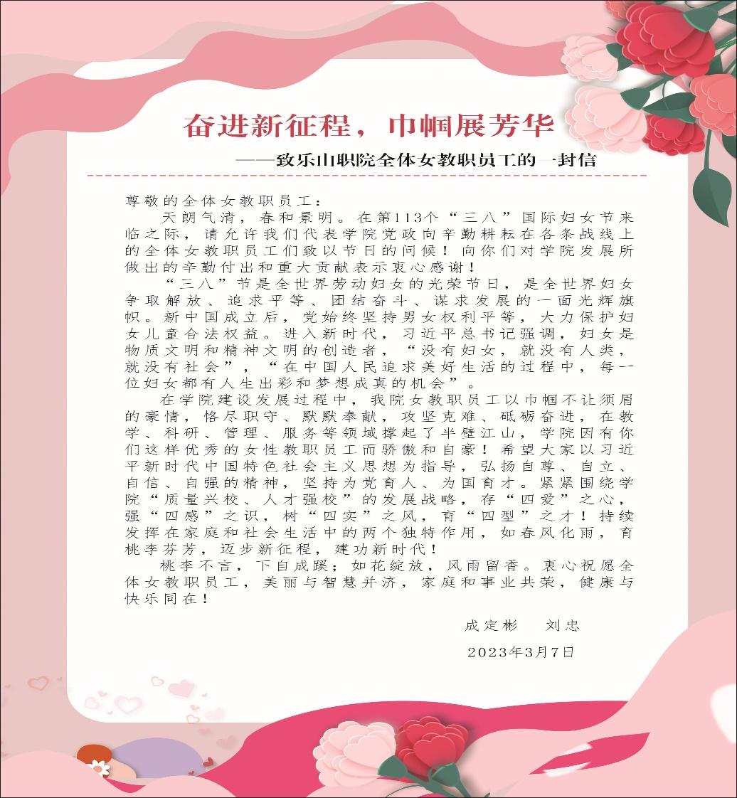 阳春三月,春意盎然。在第113个“三八”国际妇女节到来之际,学院开展了 “三八”国际妇女节系列慰问庆祝活动,活动精彩纷呈,展示了学院女性教职工在紧紧围绕学院“质量兴校、人才强校”发展战略,教书育人、开拓创新,培养“四型”人才,迈步新征程,建功新时代的巾帼风采和“开年就开跑”“起步即冲刺”的奋斗姿态。