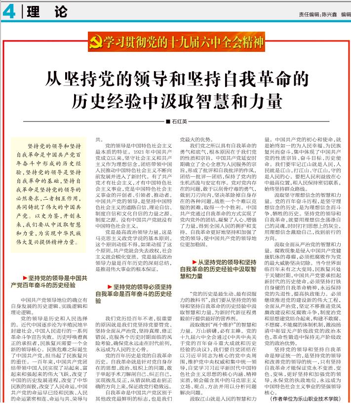 近日,经乐山市委宣传部、市社科联组织评选,共评选出12篇优秀征文。sunbet申搏官方网站马克思主义学院石红英副教授的论文《从坚持党的领导和坚持自我革命的历史经验中汲取智慧和力量》被评选为优秀征文,并被乐山市委宣传部、市社科联通报表扬。2022年5月13日,石红英老师的文章在《乐山日报》理论版全文署名刊发。这是学院开展党的十九届六中全会精神学习、阐释活动取得的一项重要成果。