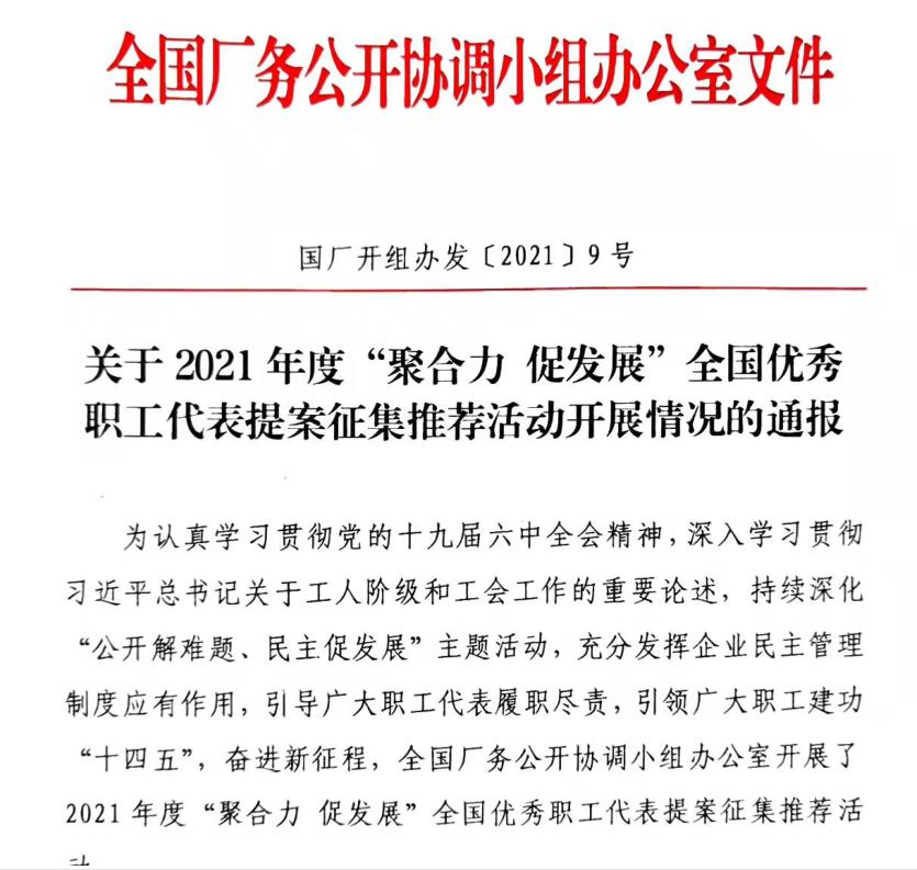 近日,学院工会从全国厂务公开协调小组办公室印发的《关于2021年度“聚合力 促发展”全国优秀职工代表提案征集活动开展情况的通报》文件中获悉,学院工会推荐报送的《关于落实在职职工父母住院期间护理照料时间的提案》获全国优秀职工代表提案奖。
