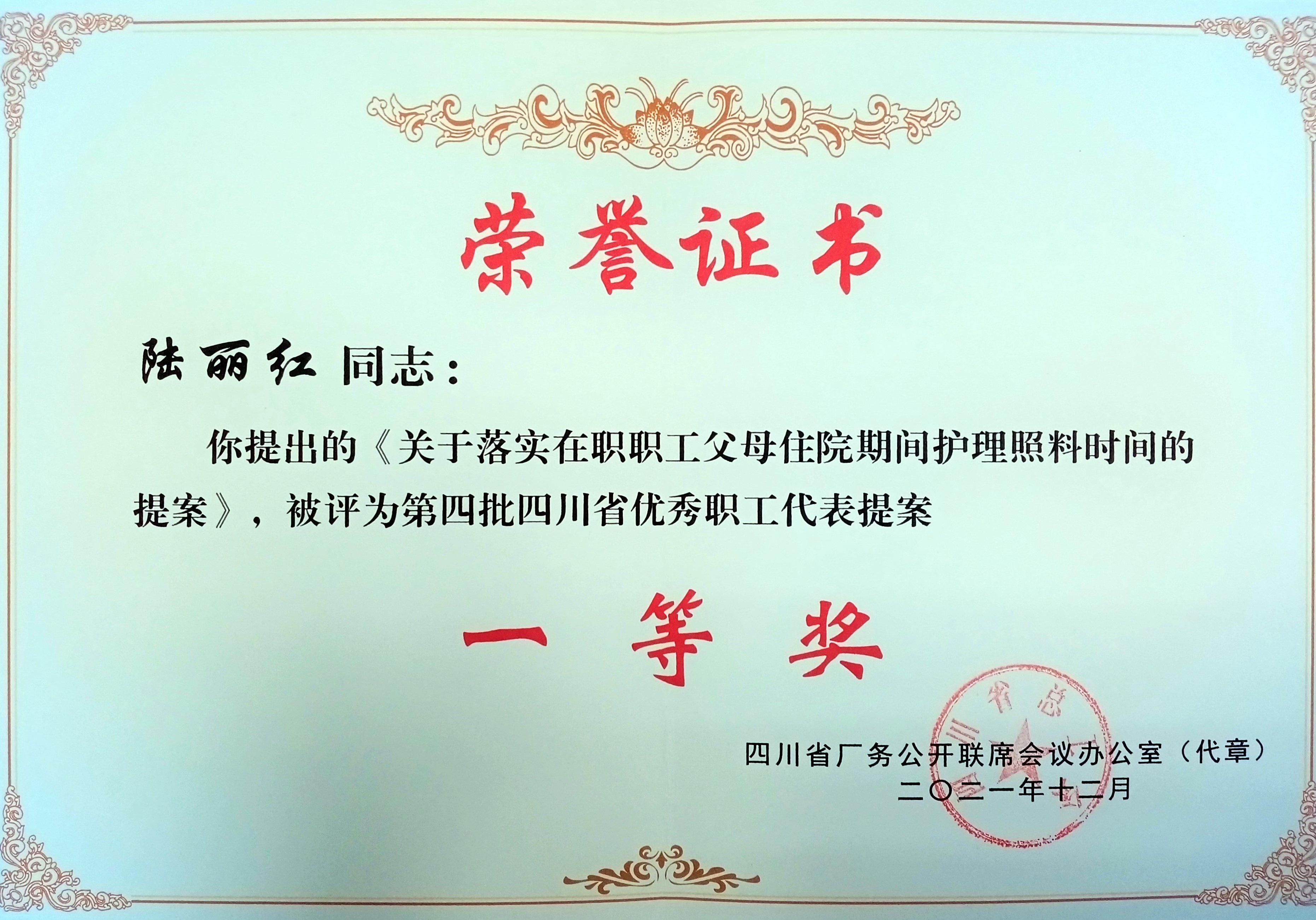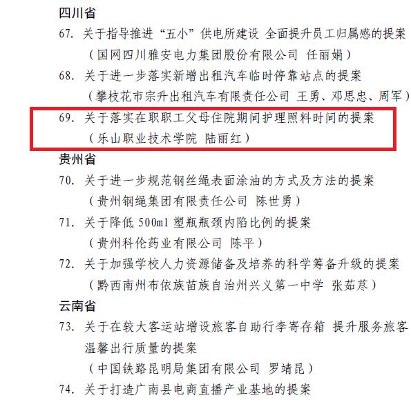 该提案是由新能源工程系职工代表陆丽红作为主提案人,杨莉频、叶常琼、张仕海、游波、黄余刚5名代表联合附议,组织人事部办结落实,经学院工会提炼修改完善后报市总、省总和全总,最终,提案获得四川省优秀提案一等奖和全国优秀职工代表提案奖。