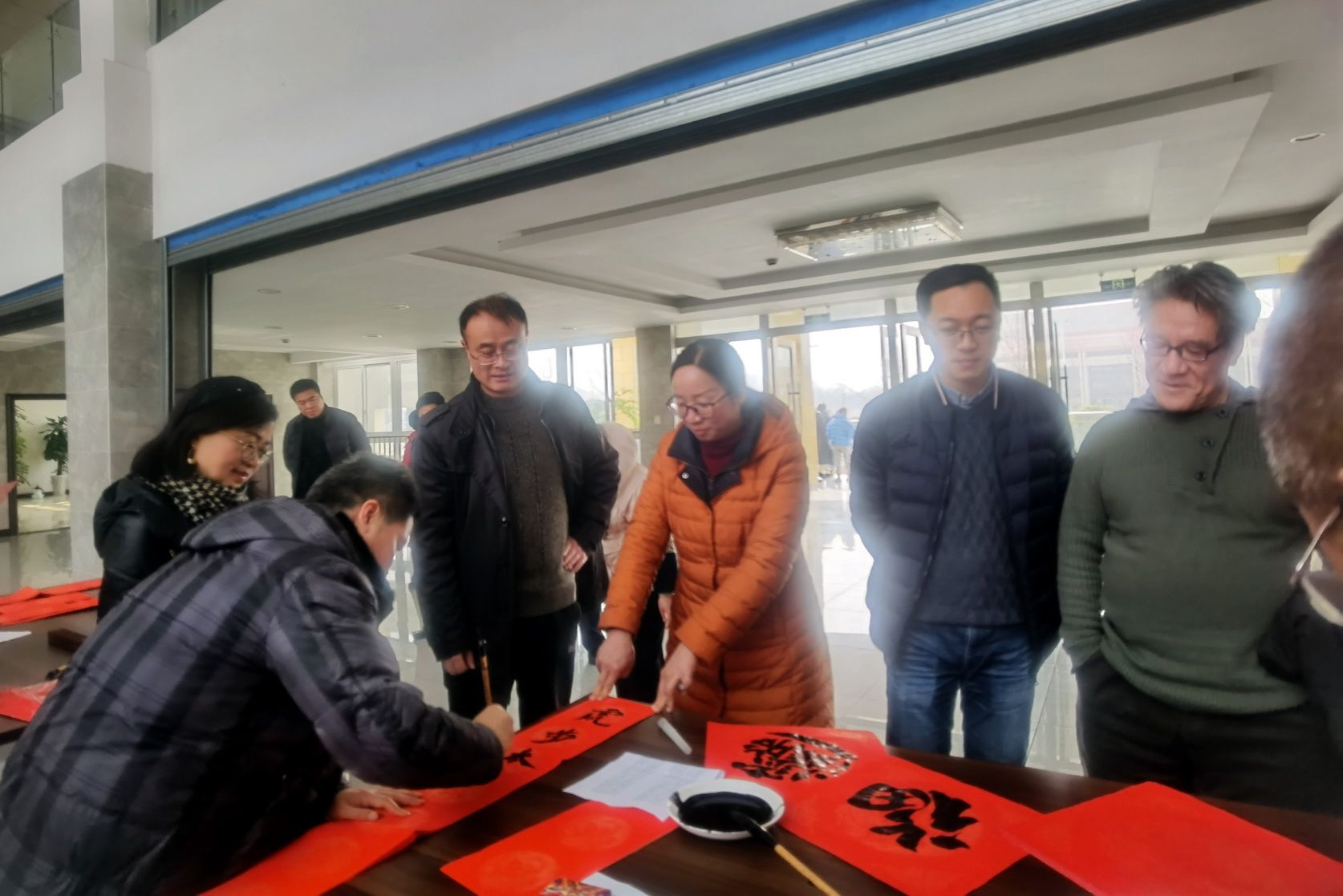 1月12日中午12点30分,由院工会组织,学院书画协会的五位老师在学院行政楼二楼大厅为全院教职工书写“福”字和春联,老师们挥毫泼墨,奋笔疾书,写下一副副喜气祥和的春联和“福”字,“千家万户虎精神,四海三江春气息”,这些春联和“福”字给教职工们送上了浓浓的新春祝福。学院院长刘忠,党委副书记、工会主席陈芝海,副院长张学河、鲍学东到现场慰问书画协会的老师们,与职工们品书交谈。工会副主席黄晓莉、马院党总支书记郑平也在活动现场为教职工书写春联和“福”字。拿到春联的教职工们满心欢喜,提前感受到浓烈祥和节日气氛。