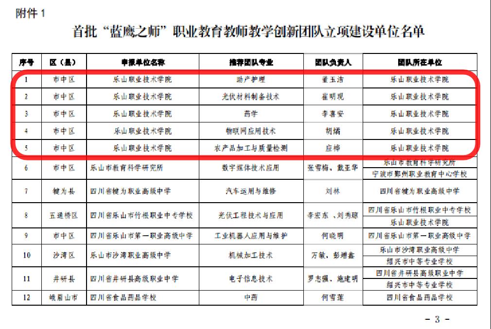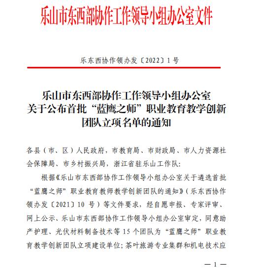 根据《乐山市东西部协作工作领导小组办公室关于遴选首批“蓝鹰之师”职业教育教师教学创新团队的通知》等文件要求,经团队申报、专家评审、网上公示、乐山市东西部协作工作领导小组办公室审定,2022年1月5日,乐山市东西部协作工作领导小组办公室确定了15个职业教育教师教学创新团队立项建设单位和2个培育建设单位,sunbet申搏官方网站助产护理、光伏材料制备技术等 5个专业团队成功入选立项建设单位。