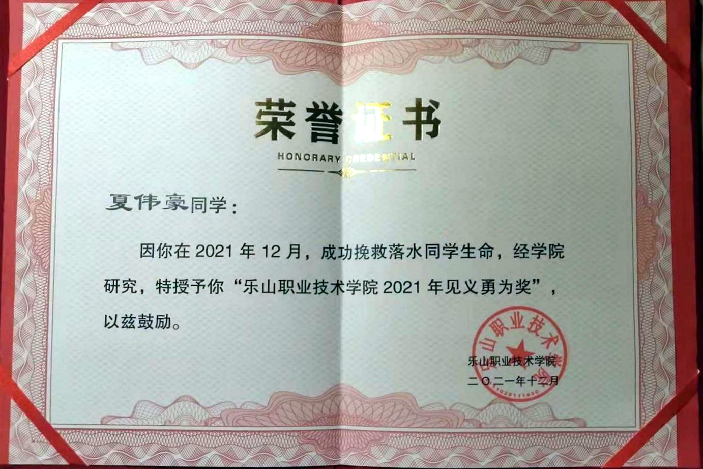 2021年12月18日下午,夏伟豪和同伴在西岸第一城外的河边散步,忽然看见一名女子在青衣江边河滩处游玩时不慎落水,时值寒冬,江水刺骨,此处水流湍急,河水已经没过了她的膝盖,该女子一时不知所措,情况十分危急!夏伟豪见状没有丝毫犹豫翻过河堤护栏跳下陡坡,穿过江边一人多高的杂草丛,以最快的速度越过乱石滩大步流星冲进冰凉的河水中,一把拉住女子的胳膊将其抱起,踉踉跄跄回到岸边。待女子情绪稳定后,夏伟豪与同伴随即又将落水女子送到乐山市人民医院检查,然后二人悄然离去。