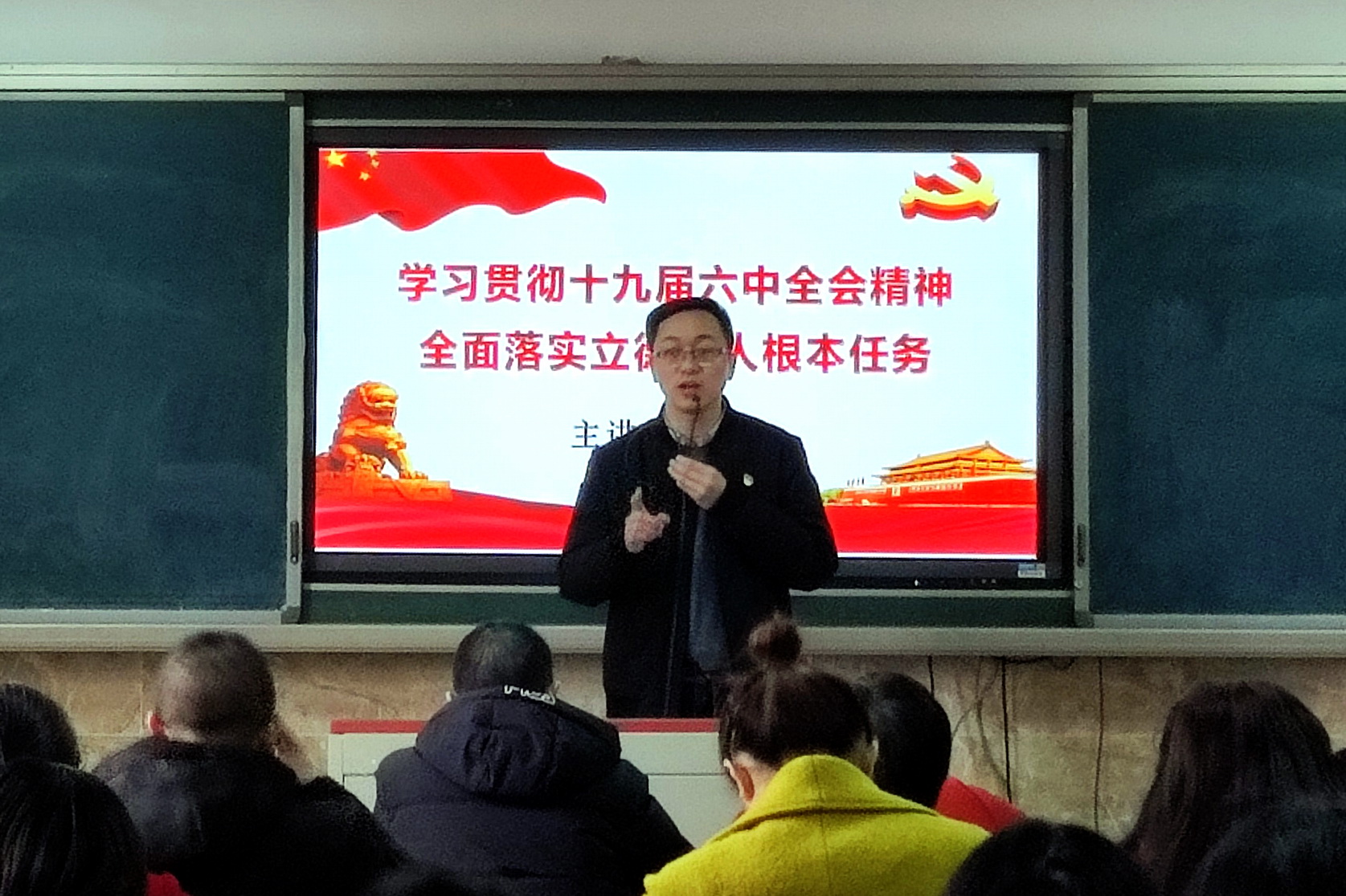 2021年12月15日中午,学院党委委员、副院长鲍学东在教学楼1B104教室,为马克思主义学院、基础公共课程部(体育系)、机电工程系全体党员上党课。