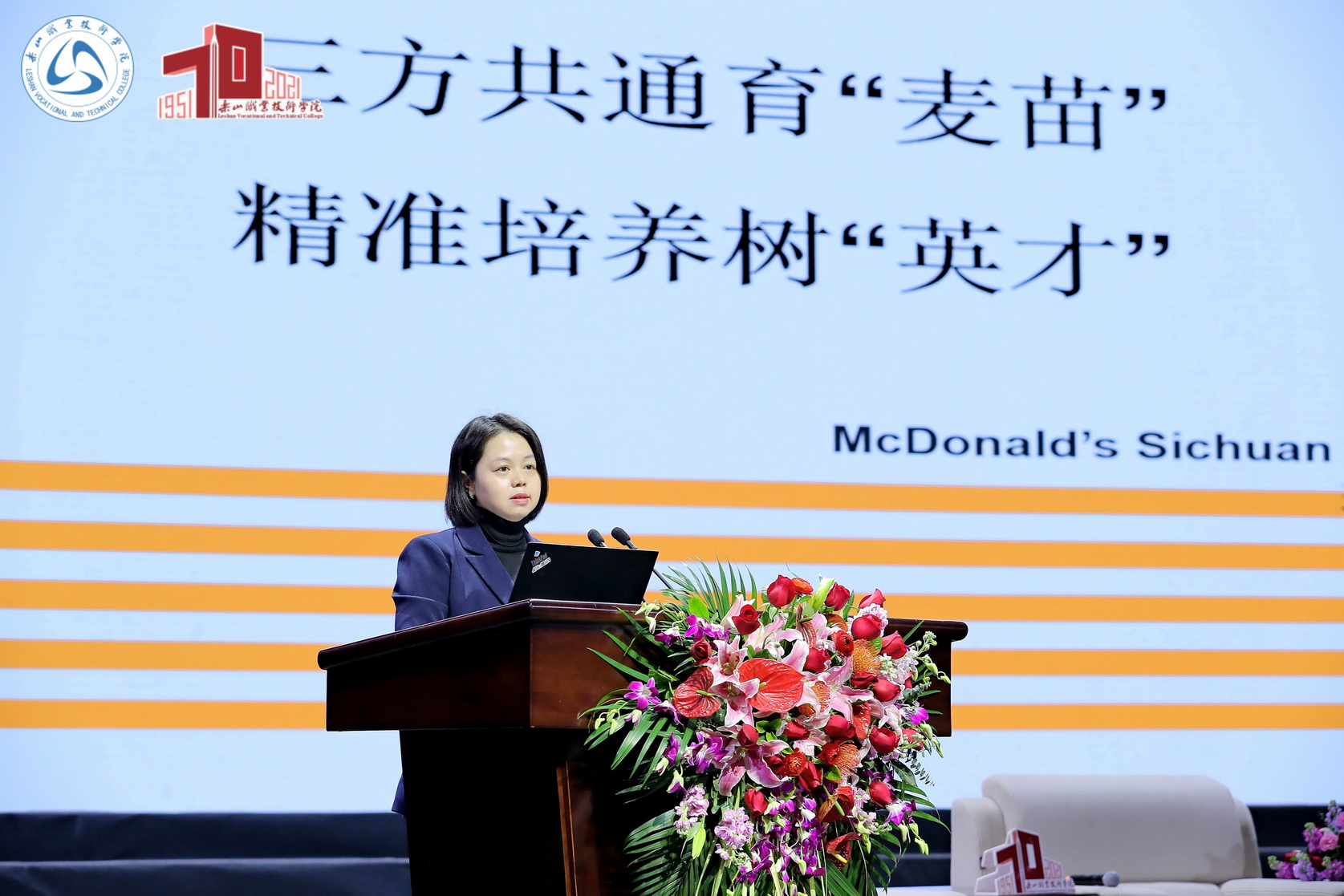 四川金拱门食品有限责任公司人力资源总监刘仕琦作了题为《三方共通育麦苗,精准培养树英才》的专题报告,结合学院与四川金拱门食品有限责任公司共同打造的“麦苗计划”,阐述对如何培养英才,如何实现学校、学生、企业三方共赢局面的思考。