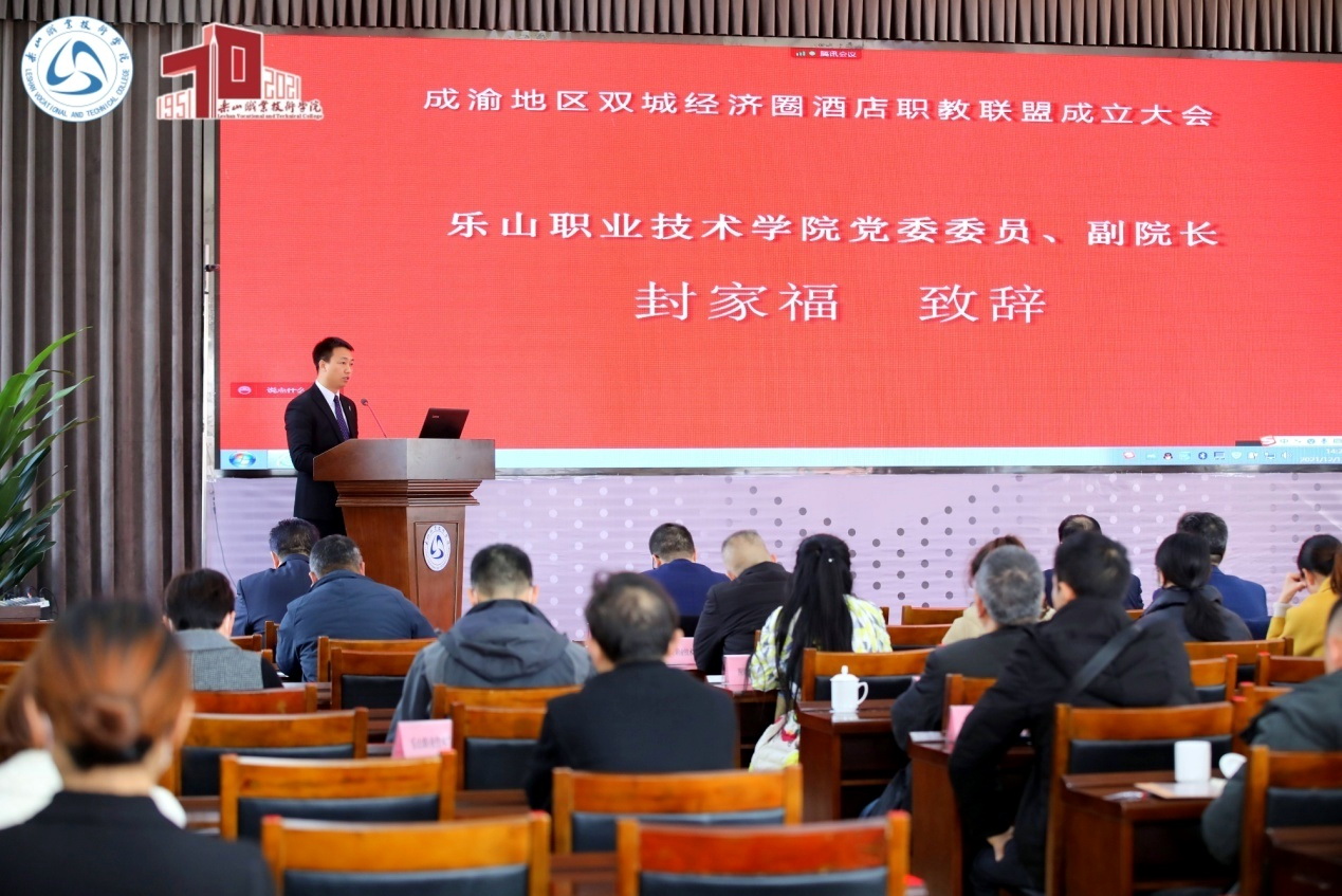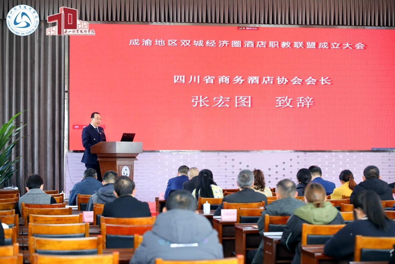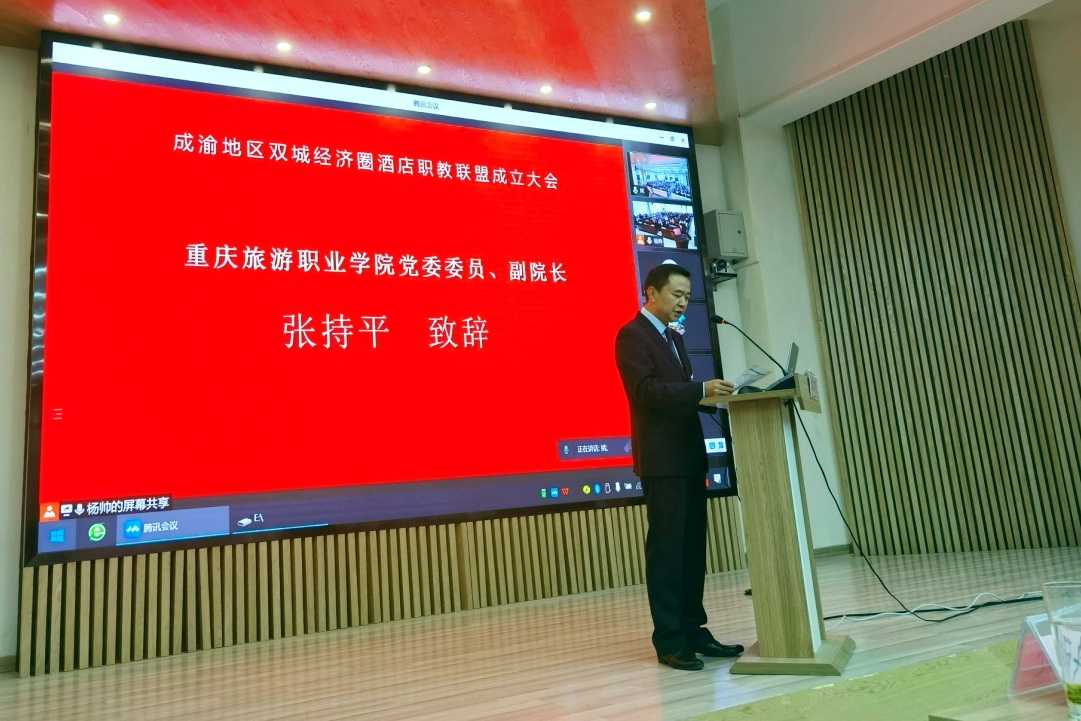 12月12日,由sunbet申搏官方网站、重庆旅游职业学院、四川省商务酒店协会联合组织发起的“成渝地区双城经济圈酒店职教联盟”成立大会在sunbet申搏官方网站召开。sunbet申搏官方网站党委委员、副院长封家福,重庆旅游职业学院党委委员、副院长张持平,四川省商务酒店协会会长张宏图出席会议。来自成渝地区相关院校、企事业等30余家单位领导、专家、企业家代表以及sunbet申搏官方网站、重庆旅游职业学院师生代表参加会议。会议采用线上线下相结合的方式进行,在sunbet申搏官方网站、重庆旅游职业学院设立两个线下会场,两个会场通过腾讯会议进行线上同步连接。