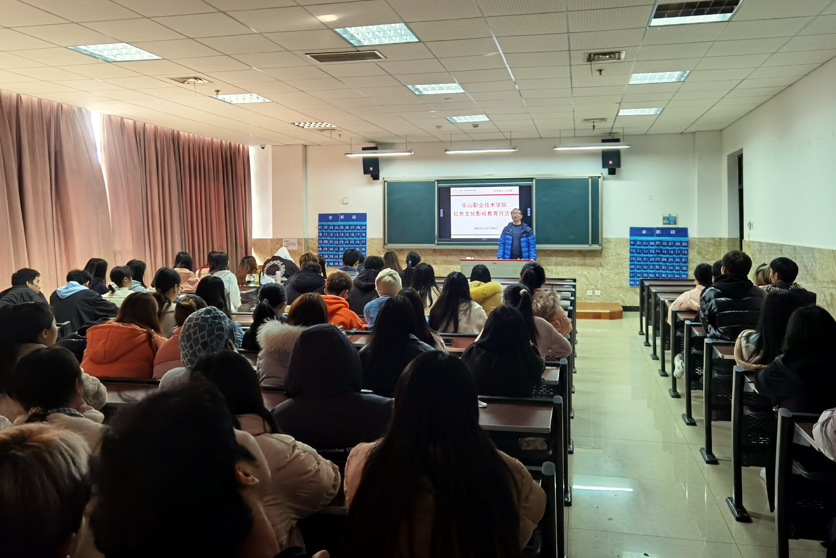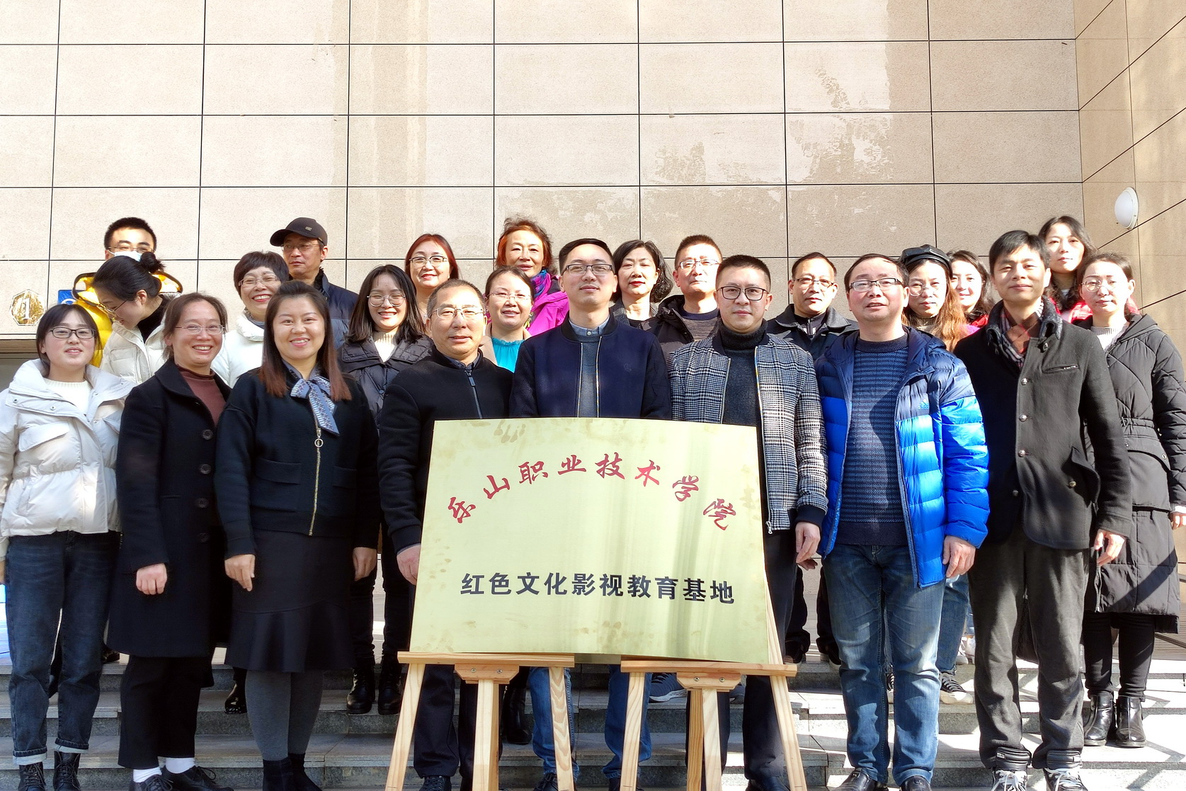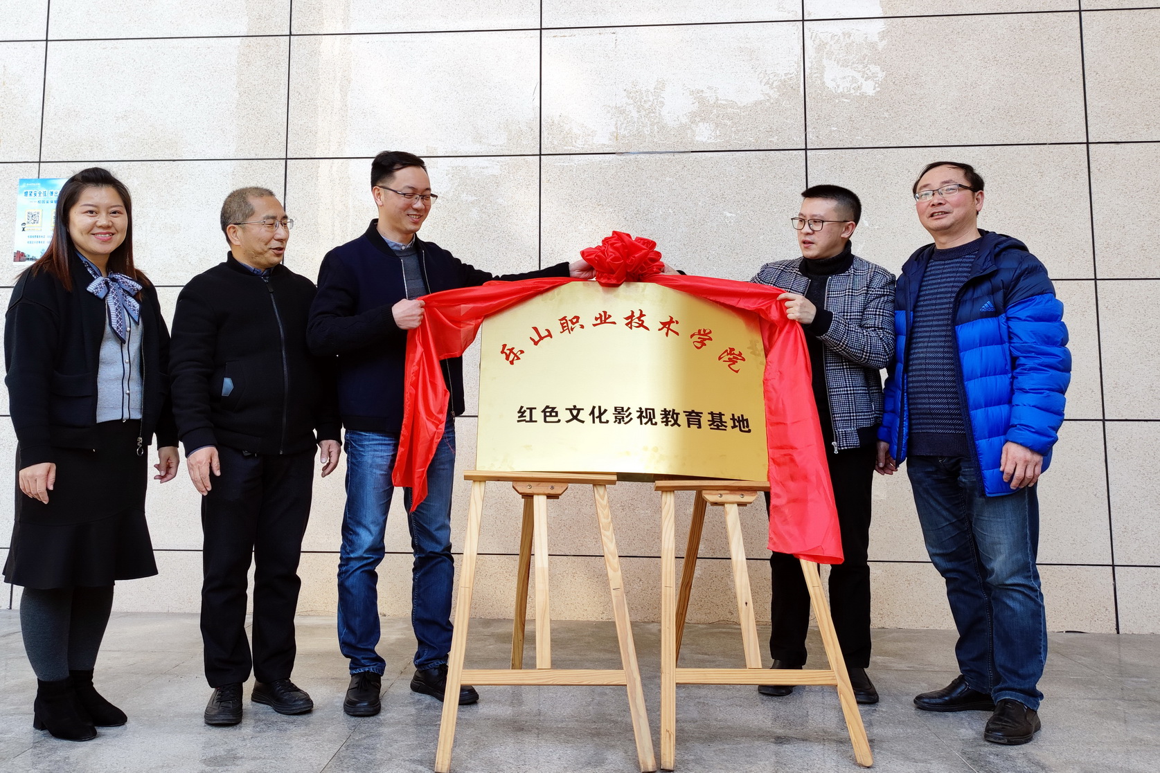 “红色文化影视教育基地”揭牌仪式在学院礼堂举行,学院党委委员、副院长鲍学东,党委委员、宣传部部长钟翼为基地揭牌。马克思主义学院班子成员与专职思政课教师参加了揭牌仪式。