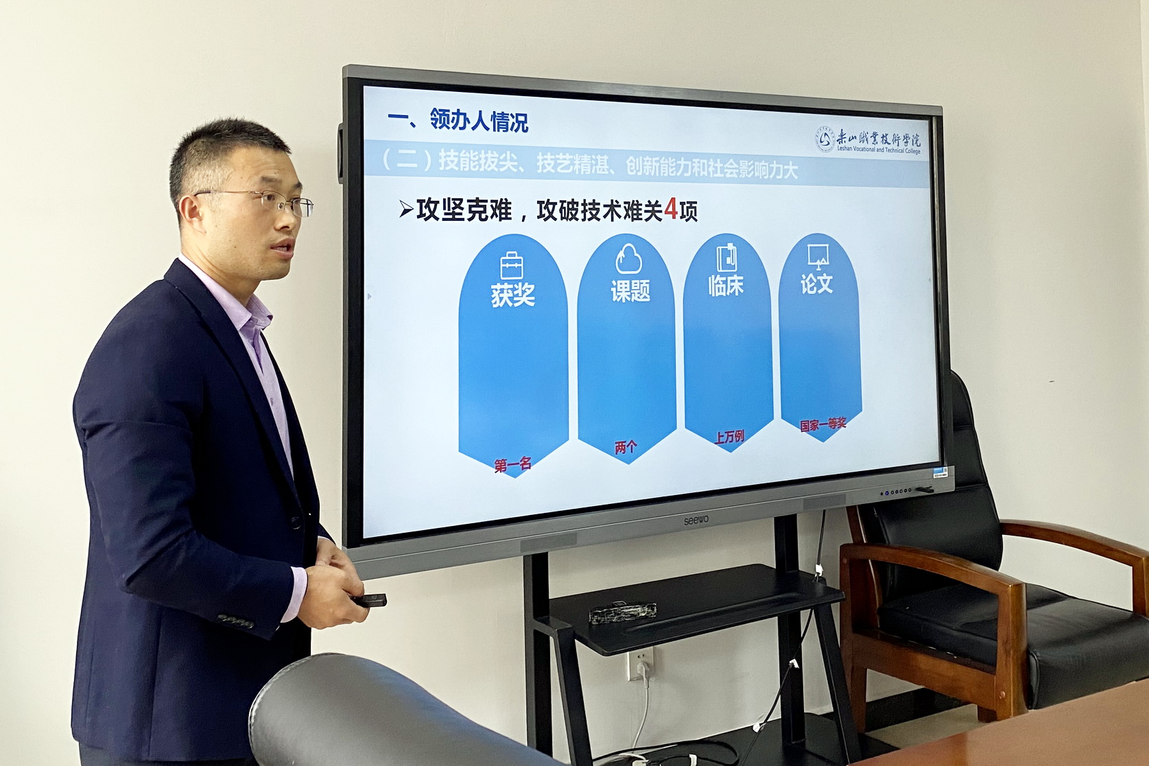 2021年11月19日上午,乐山市市级技能大师工作室现场评审会在我院行政楼324会议室举行。乐山市科学技术局社会发展科技科工程师李健、中共乐山市委组织部高端人才服务中心主任张晓萍、乐山市人力资源和社会保障局职业能力建设科副科长赵欧雅、乐山市经济和信息化局企业人才科副科长李勇强及评审专家参加了评审。会议由学院党委副书记陈芝海主持,组织人事部、教务处、医护系相关负责人参加了此次评审。