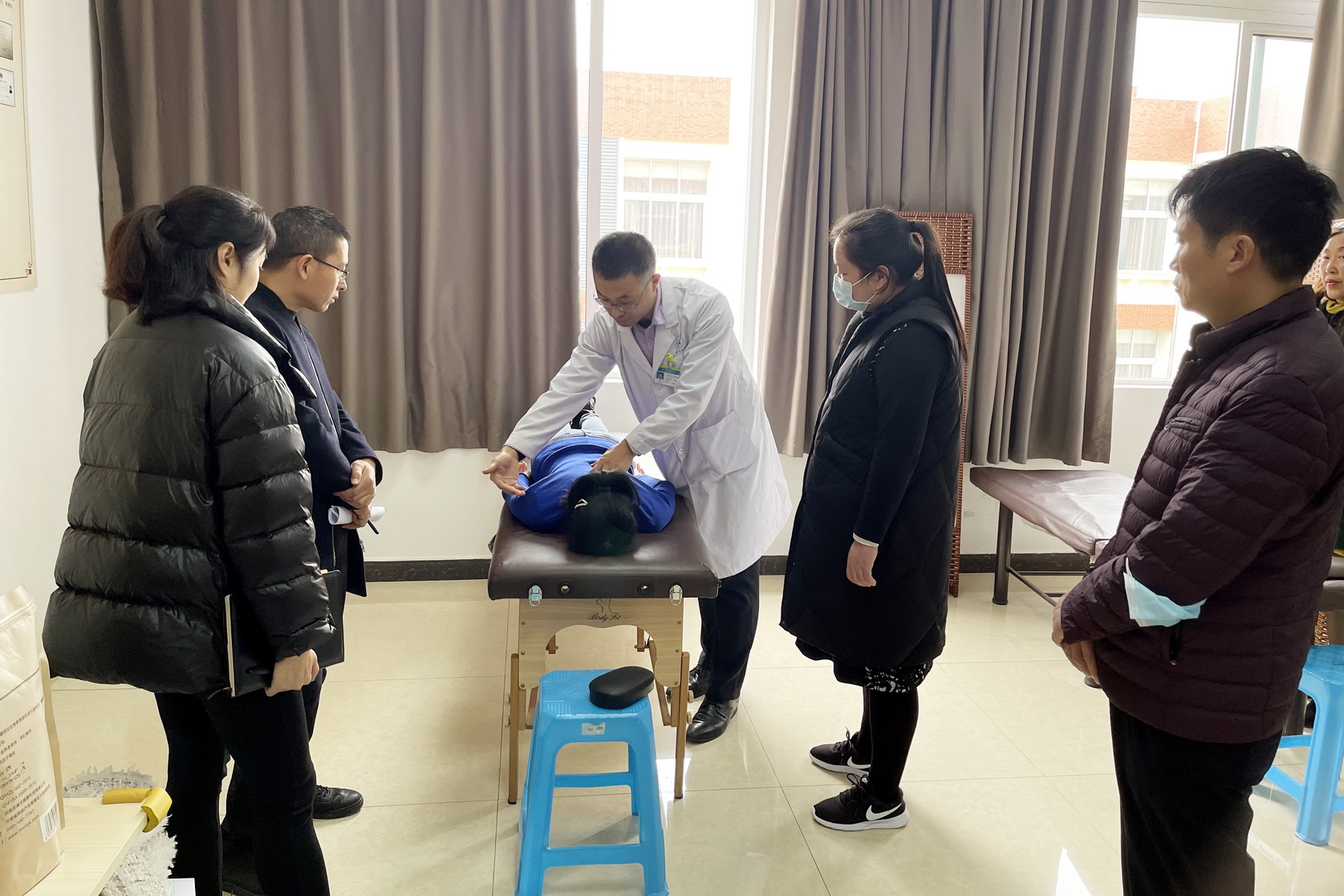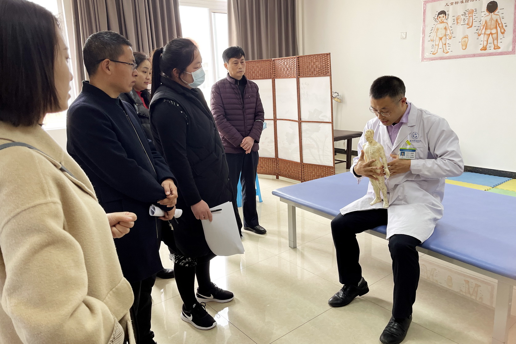 会后,评审专家一行前往保健按摩(小儿推拿)技能大师工作室开展实地考察,工作室领办人向亚君简要介绍了工作室设施设备、工作制度、带徒传技情况以及工作室的发展思路,并现场演示了小儿推拿手法,专家组高度评价了向亚君老师娴熟、专业的推拿手法。