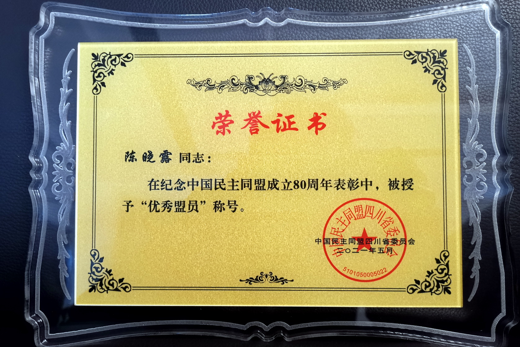 大会表彰了先进基层组织和优秀盟员。民盟乐山市委委员、支部副主委陈晓露在纪念中国民主同盟成立80周年表彰中,被民盟四川省委授予“优秀盟员”称号。