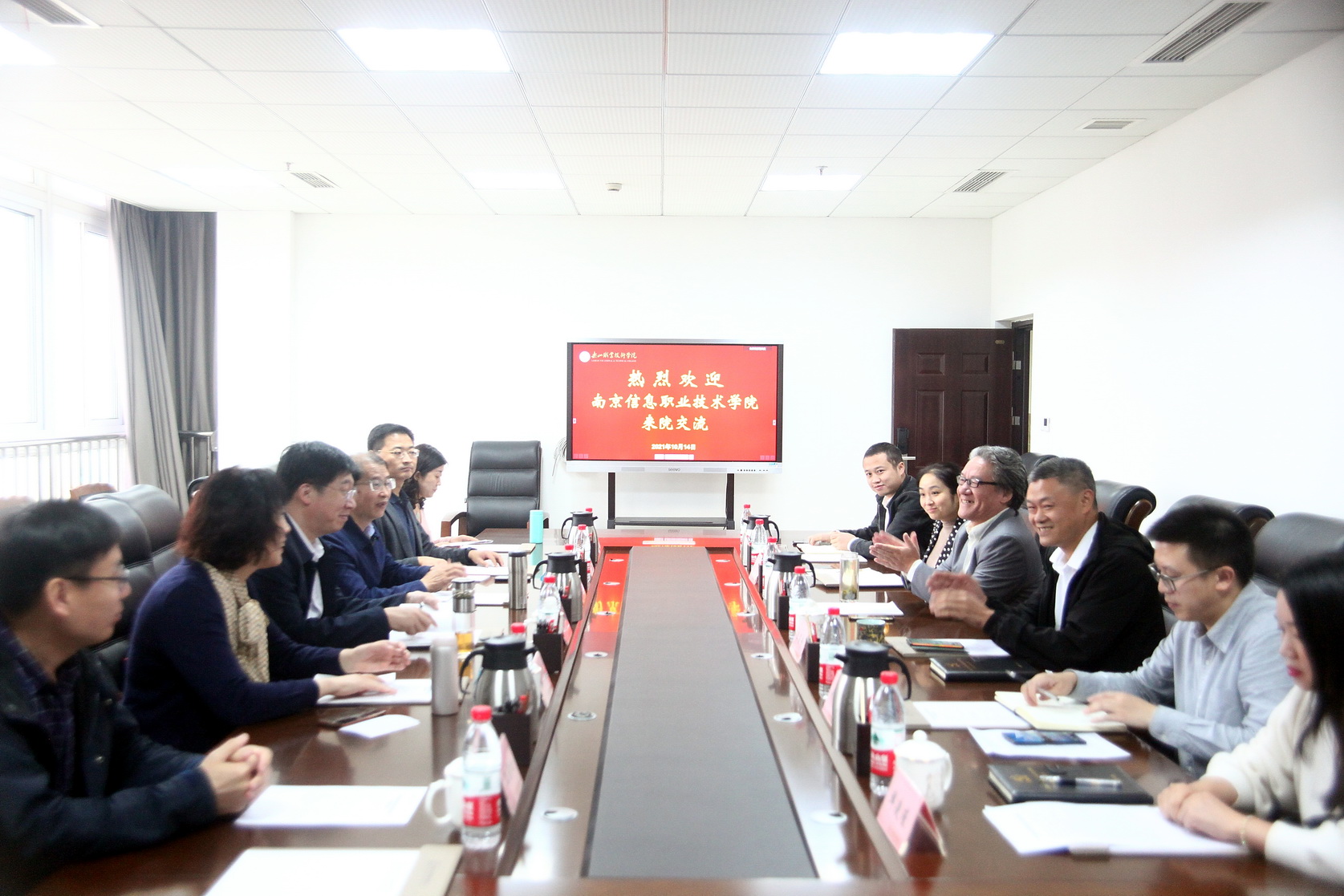2021年10月15日,南京信息职业技术学院党委书记王丹中,党委副书记、纪委书记施泽波一行来院交流,学院党委副书记陈芝海,党委委员、纪委书记李昌贵以及相关部门负责人参加了座谈交流会。