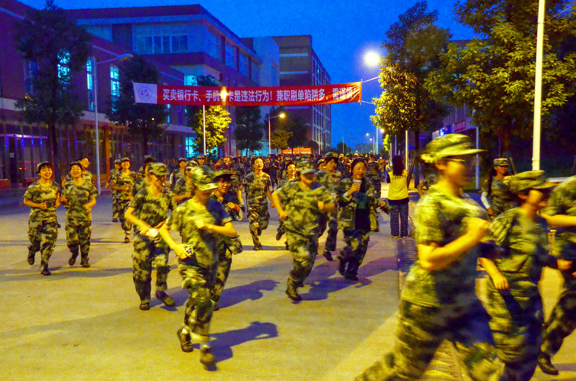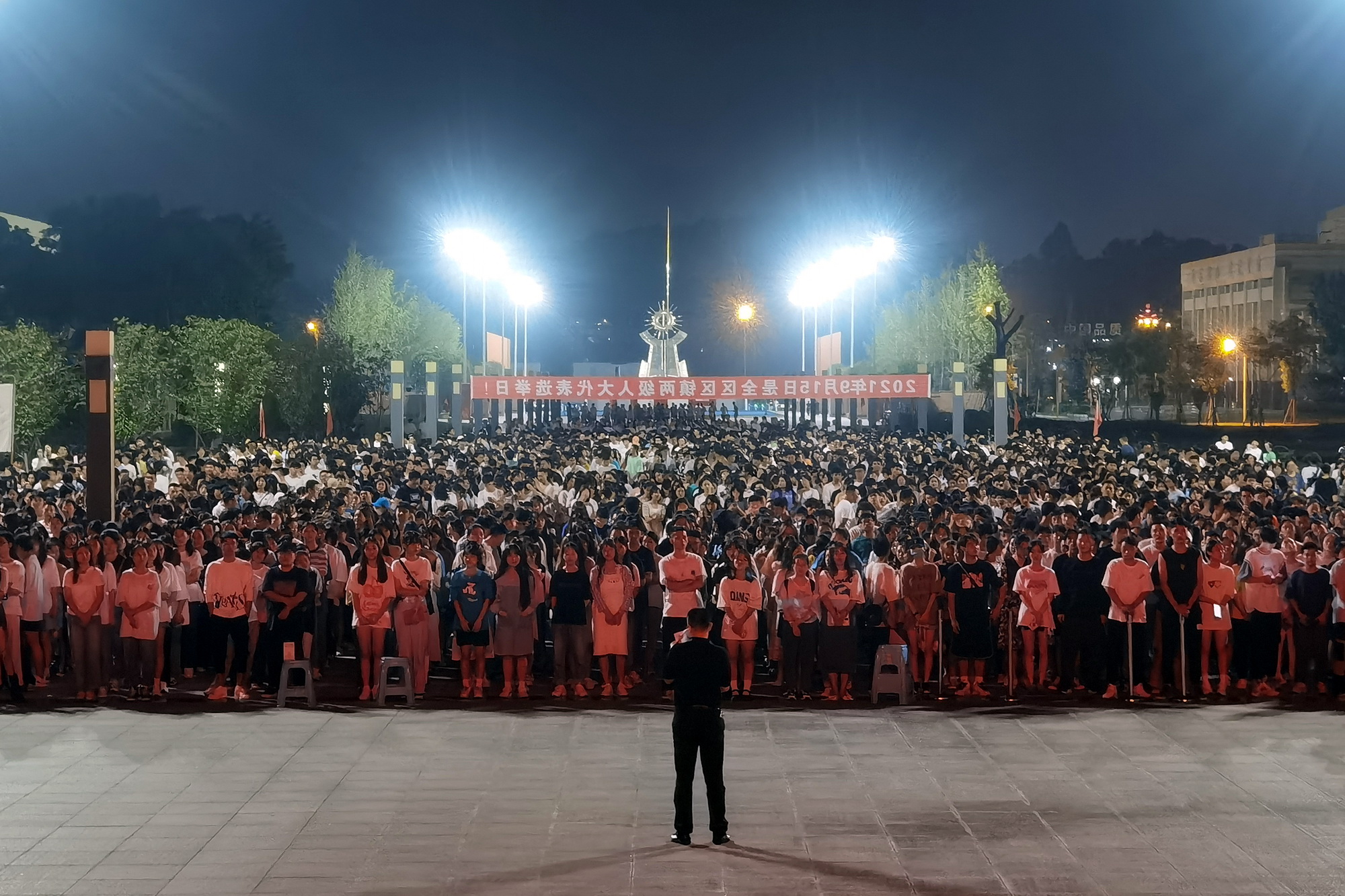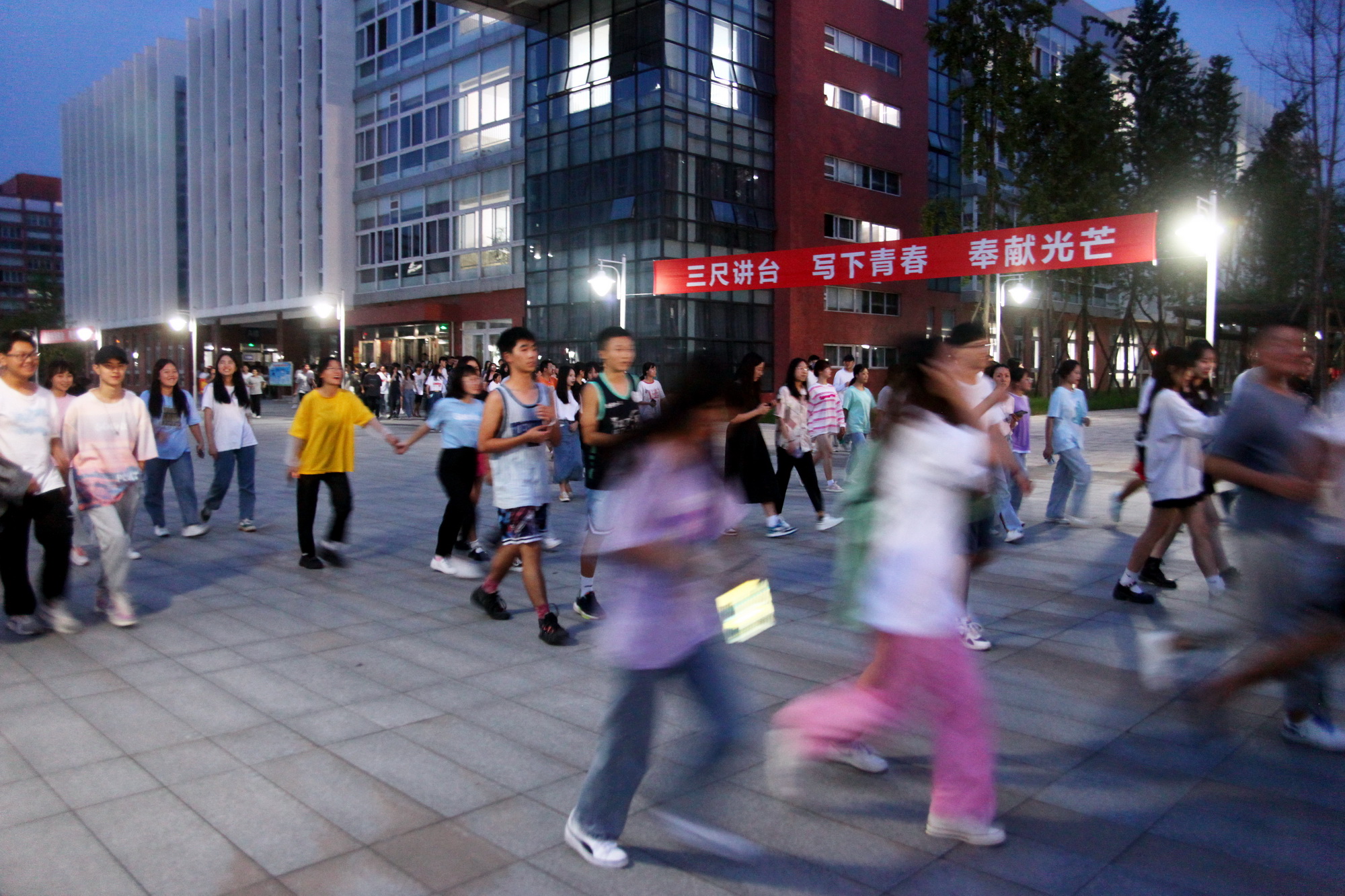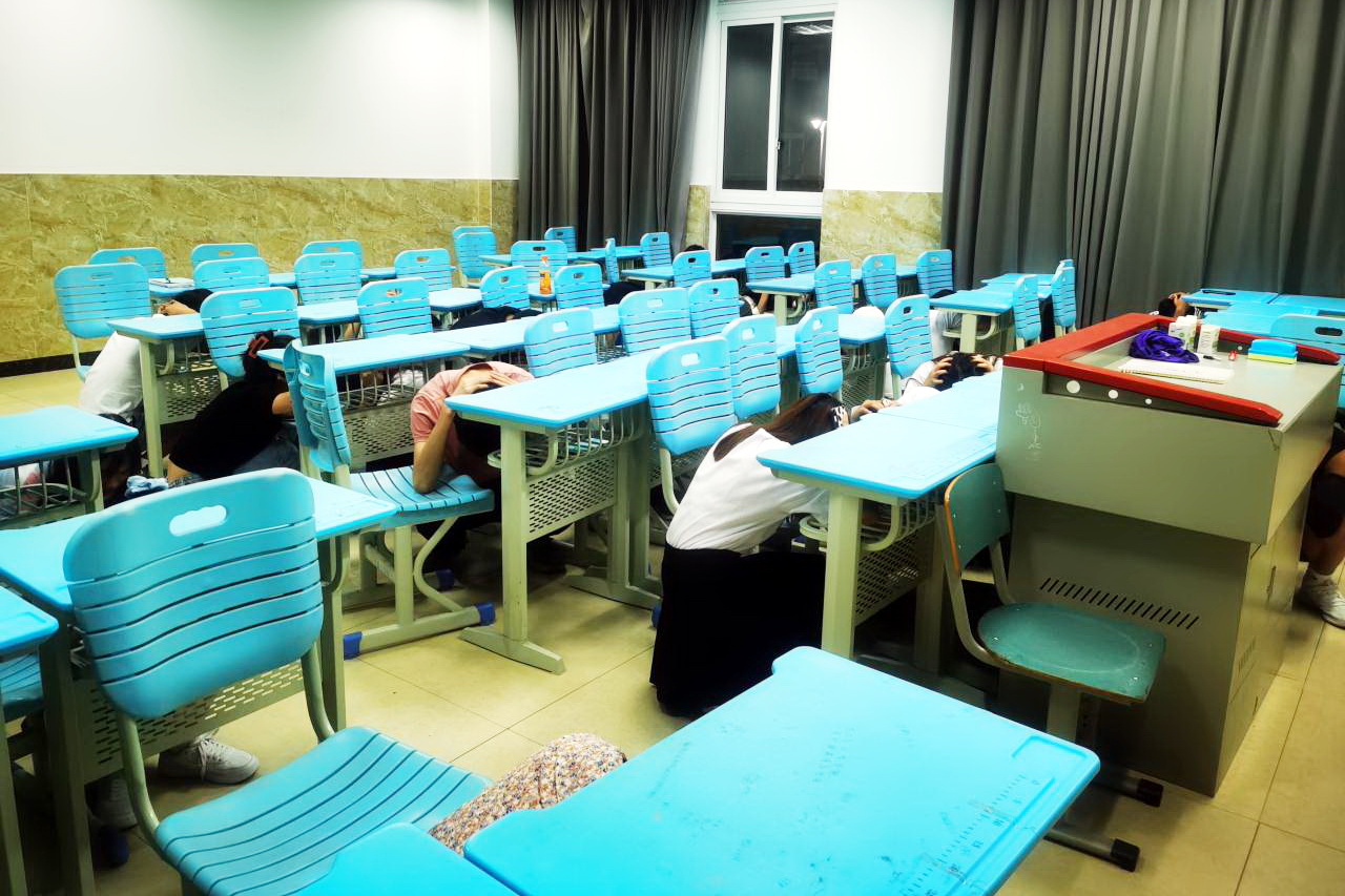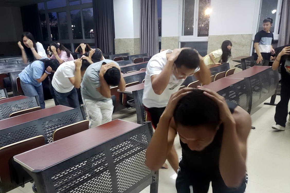 19:30分,地震警报声响起,各楼宇内学生迅速拿起遮挡物保护好头部立即躲进课桌或遮挡物下面。当第二次警报响起,广播中语音提示“地震主震结束,请同学们开始有序撤离”时,大一新生从学生宿舍迅速撤离主运动场,老生从教学楼迅速撤离到图书馆前广场。