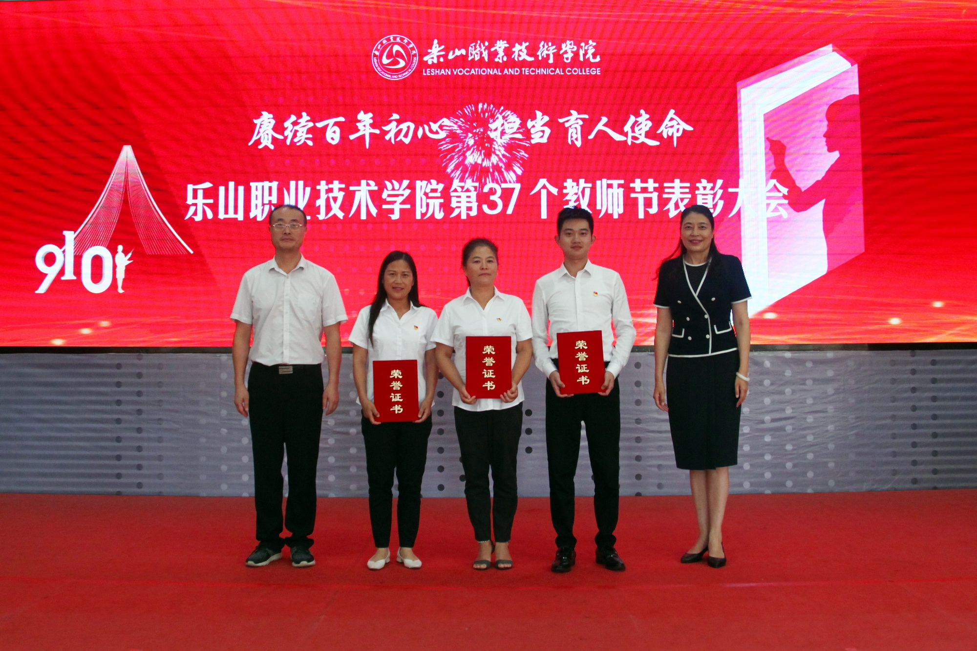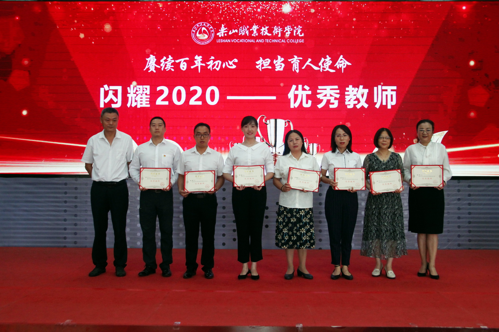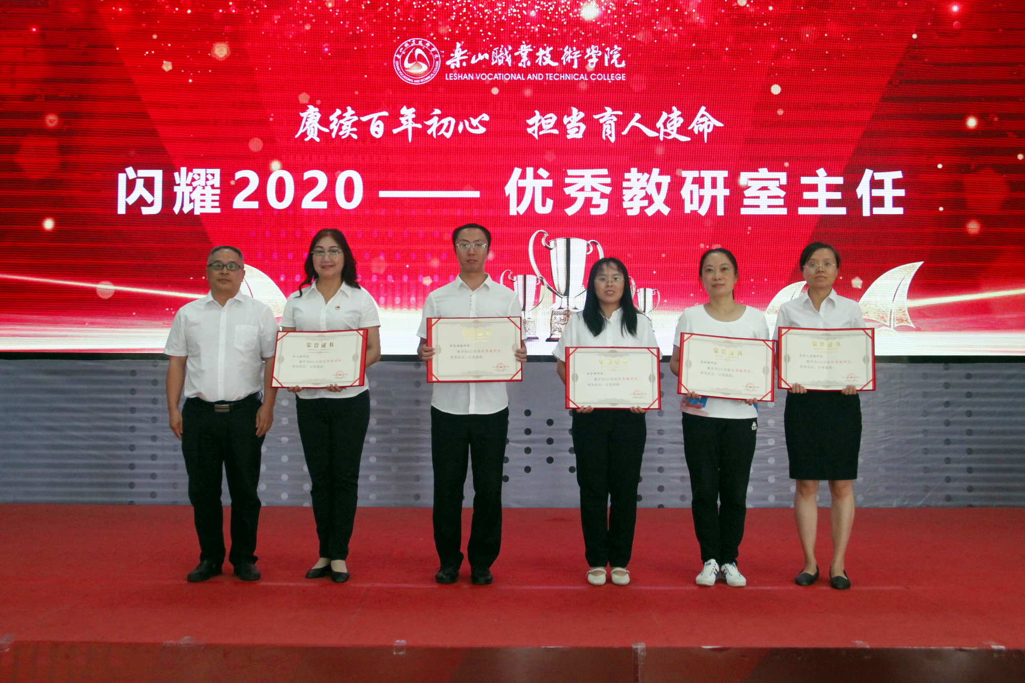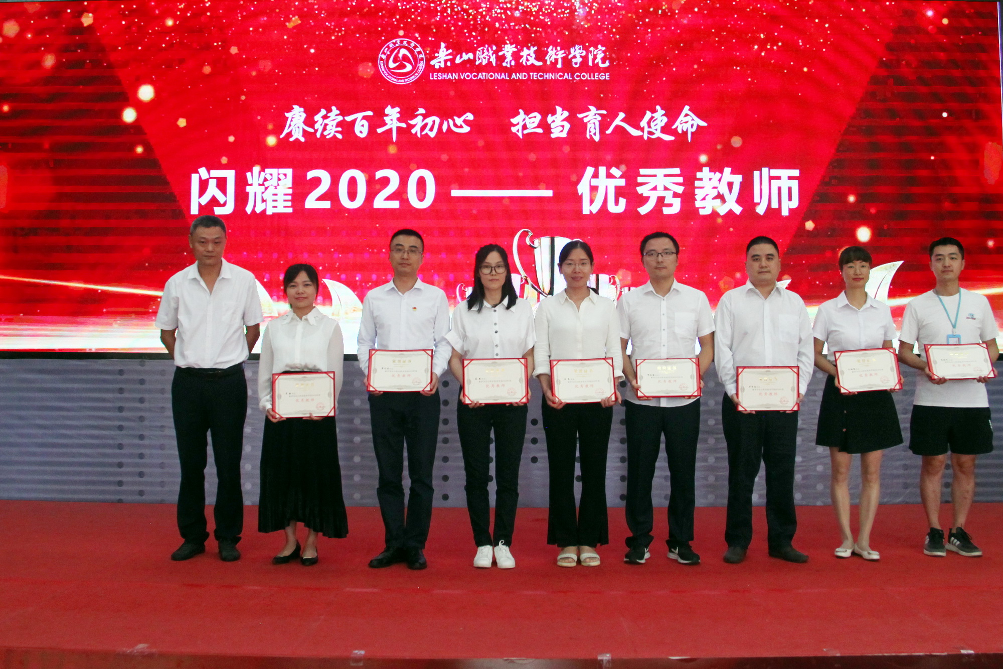 表彰环节,一共分为11个部分,分别为乐山市“优秀教育工作者 ”“优秀班主任”“优秀教师”,院级“先进工作者”、院级“优秀教师”、院级“优秀辅导员”、院级工会先进个人、院级工会先进集体,院级优秀教研室及优秀教研室主任、四川省高等学校省级“课程思政”示范课程、四川省高等学校省级“课程思政”示范专业、四川省高等学校省级“课程思政”示范教学团队、教育部习近平新时代中国特色社会主义思想大学习领航计划系列活动获奖团队。各奖项获奖代表依次上台接受学院领导颁奖。