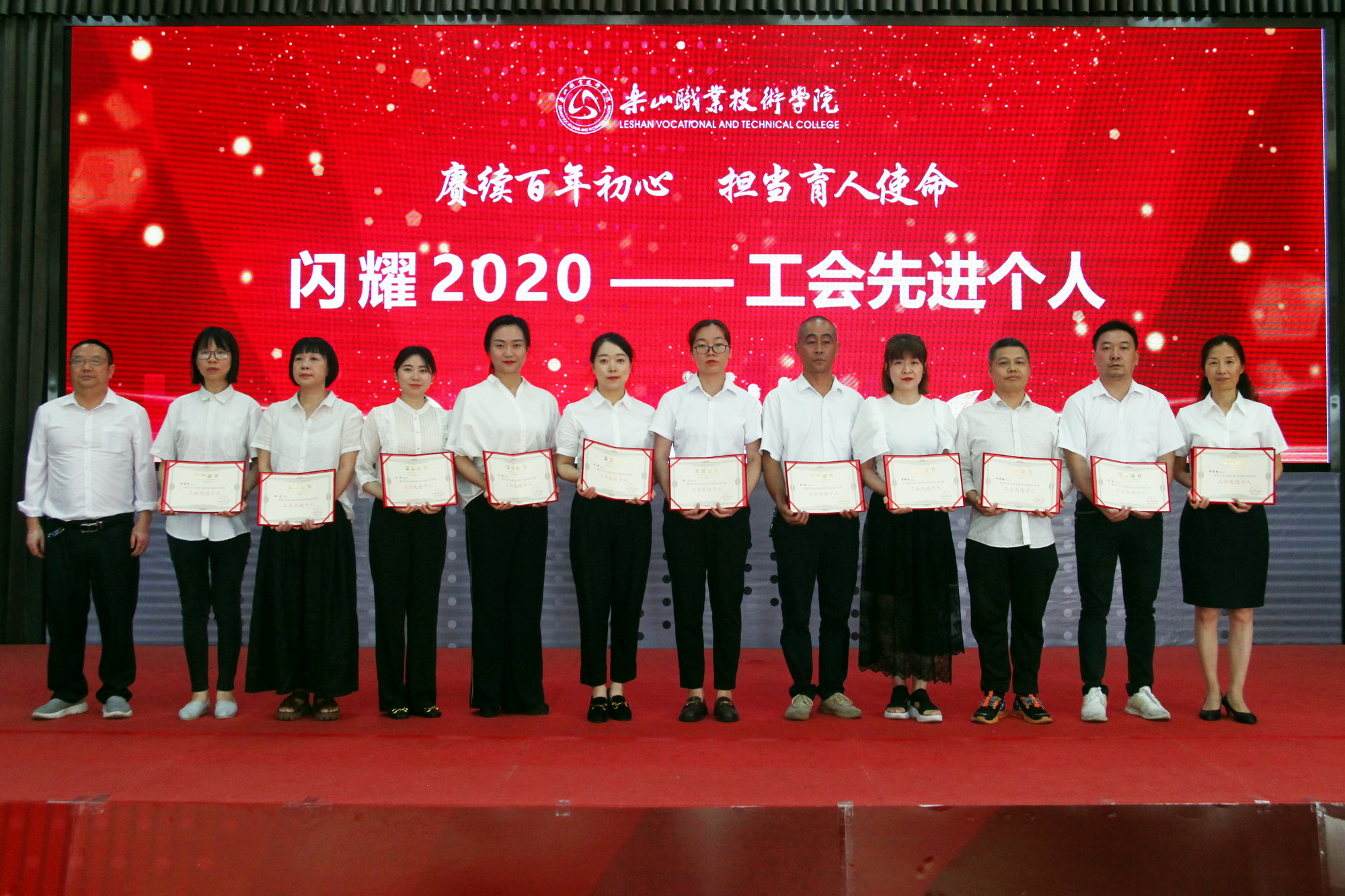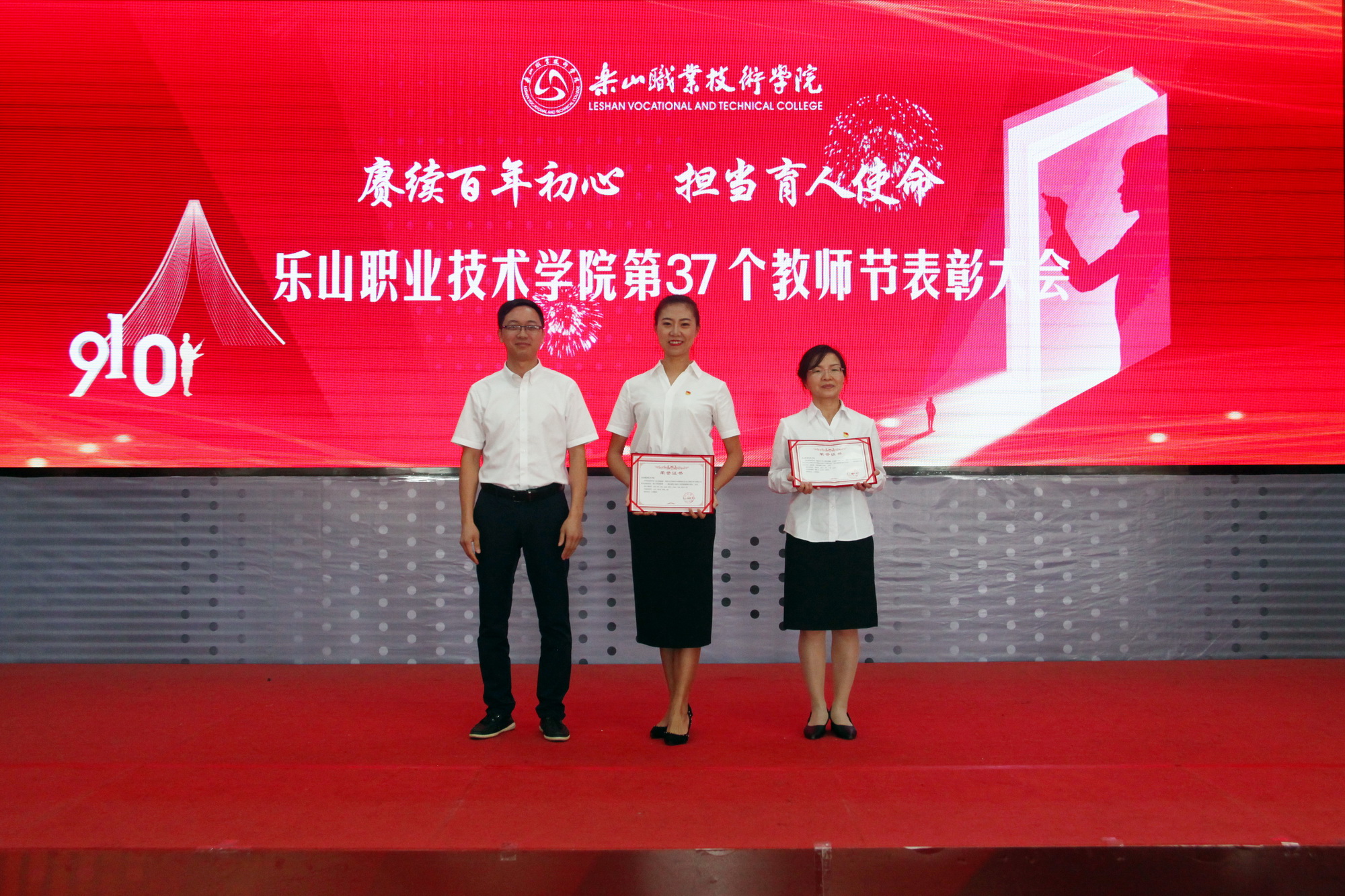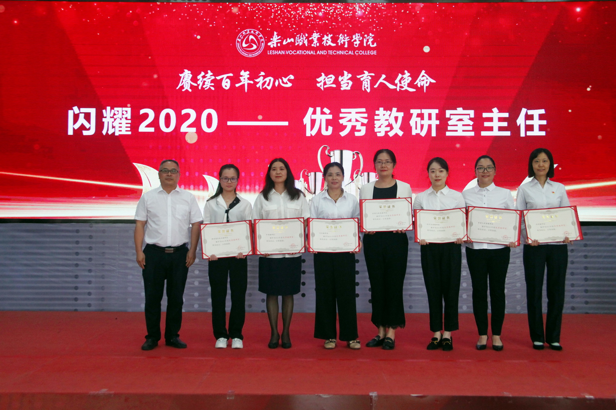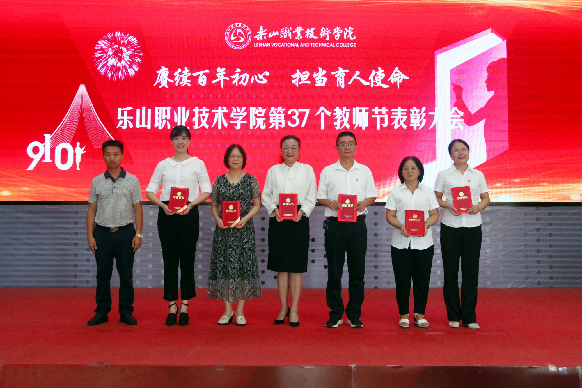 表彰环节,一共分为11个部分,分别为乐山市“优秀教育工作者 ”“优秀班主任”“优秀教师”,院级“先进工作者”、院级“优秀教师”、院级“优秀辅导员”、院级工会先进个人、院级工会先进集体,院级优秀教研室及优秀教研室主任、四川省高等学校省级“课程思政”示范课程、四川省高等学校省级“课程思政”示范专业、四川省高等学校省级“课程思政”示范教学团队、教育部习近平新时代中国特色社会主义思想大学习领航计划系列活动获奖团队。各奖项获奖代表依次上台接受学院领导颁奖。