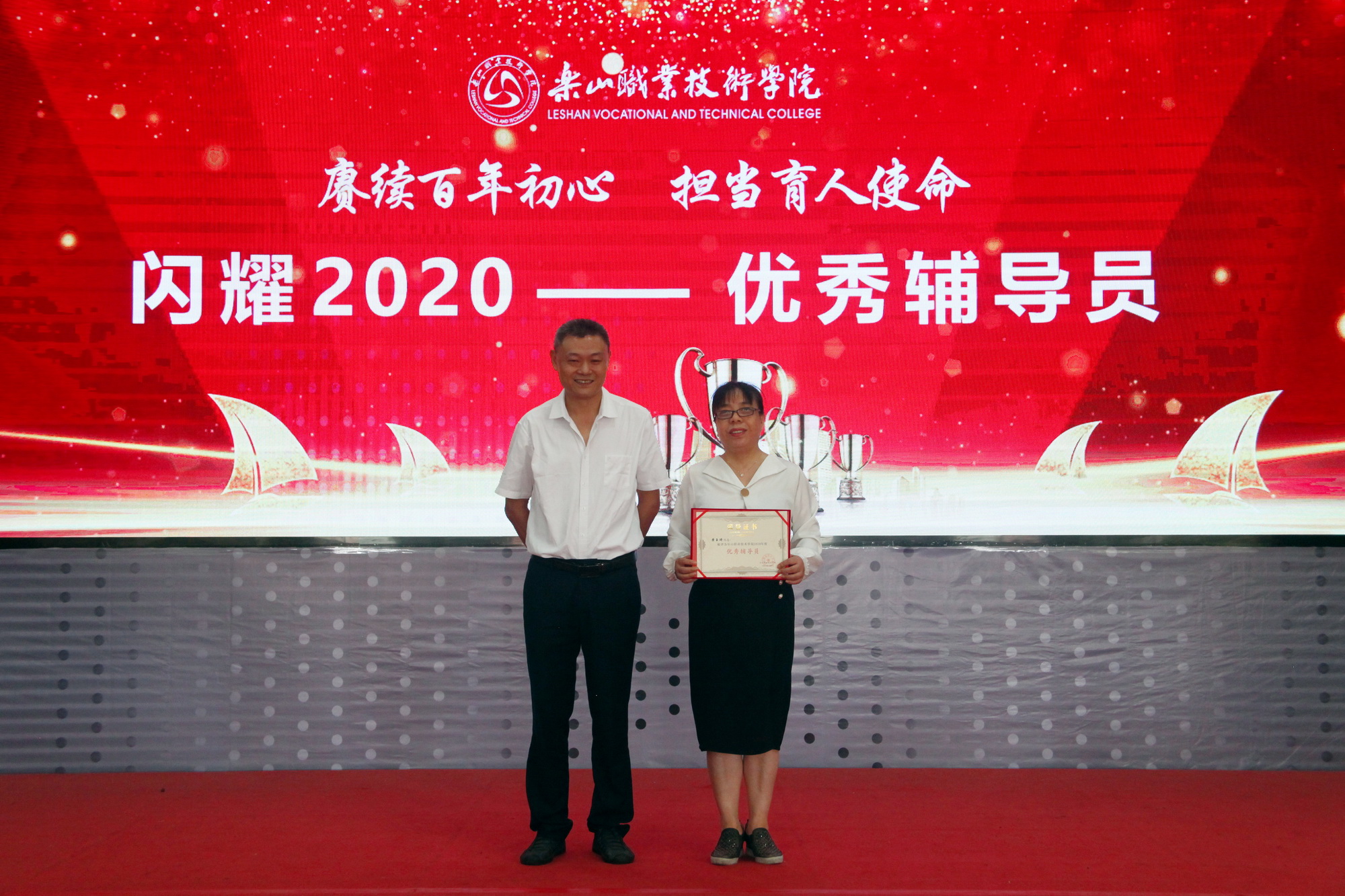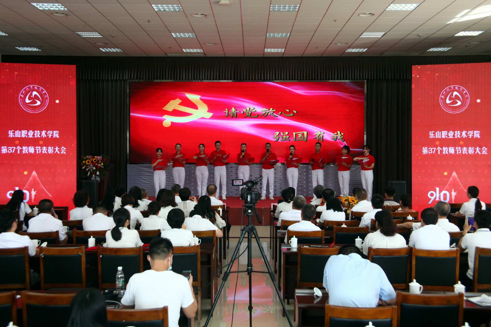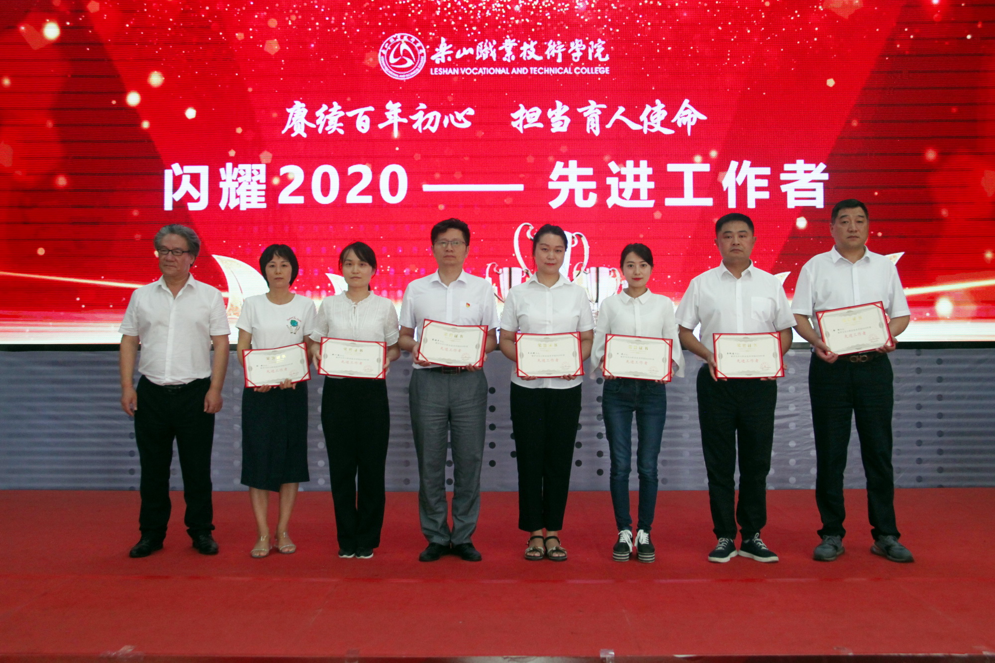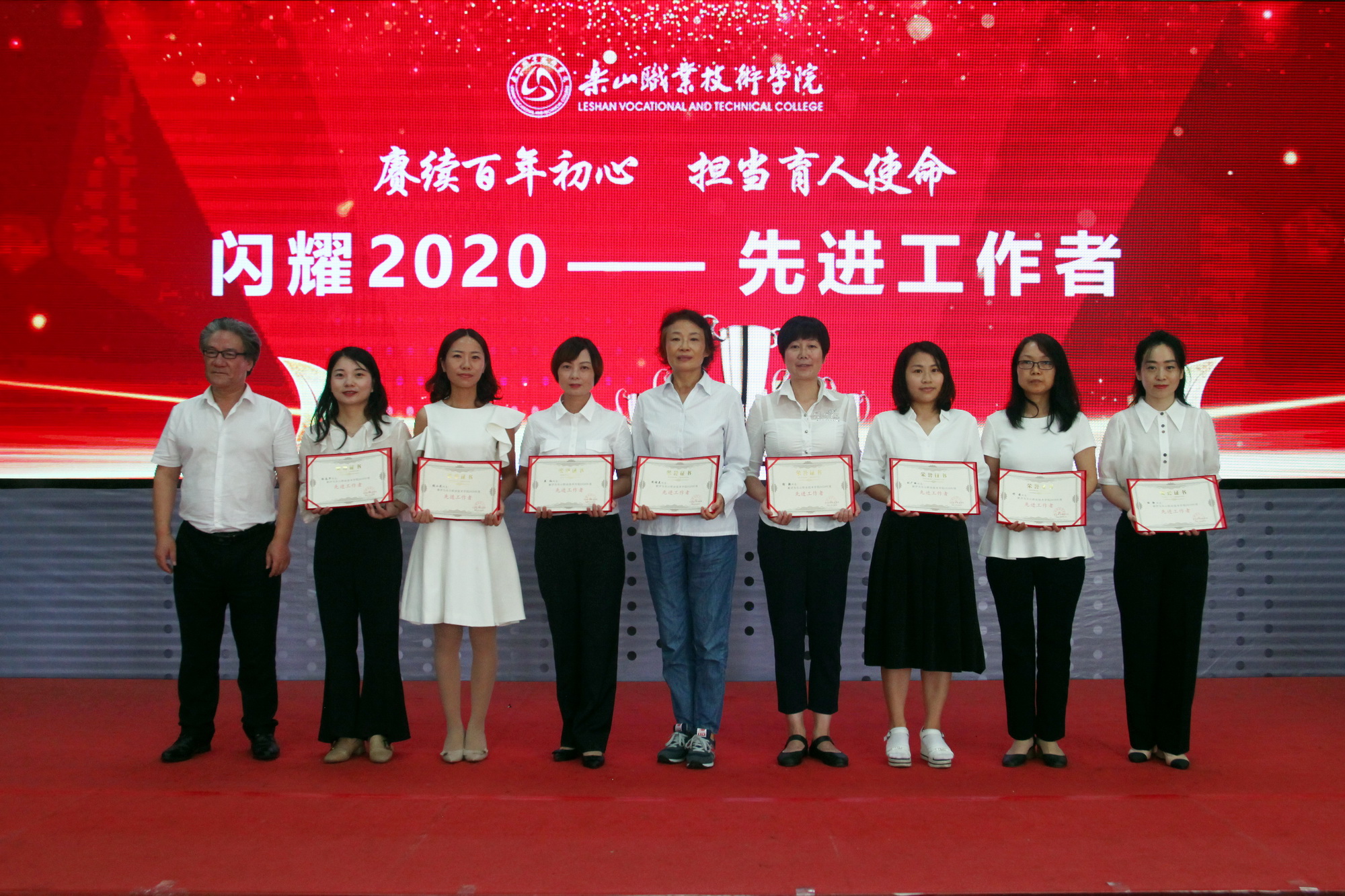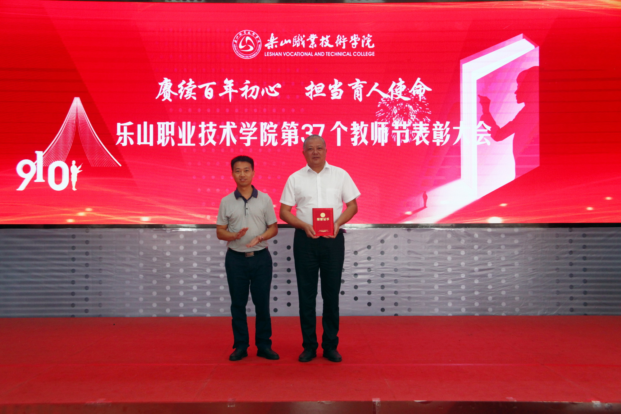 表彰环节,一共分为11个部分,分别为乐山市“优秀教育工作者 ”“优秀班主任”“优秀教师”,院级“先进工作者”、院级“优秀教师”、院级“优秀辅导员”、院级工会先进个人、院级工会先进集体,院级优秀教研室及优秀教研室主任、四川省高等学校省级“课程思政”示范课程、四川省高等学校省级“课程思政”示范专业、四川省高等学校省级“课程思政”示范教学团队、教育部习近平新时代中国特色社会主义思想大学习领航计划系列活动获奖团队。各奖项获奖代表依次上台接受学院领导颁奖。