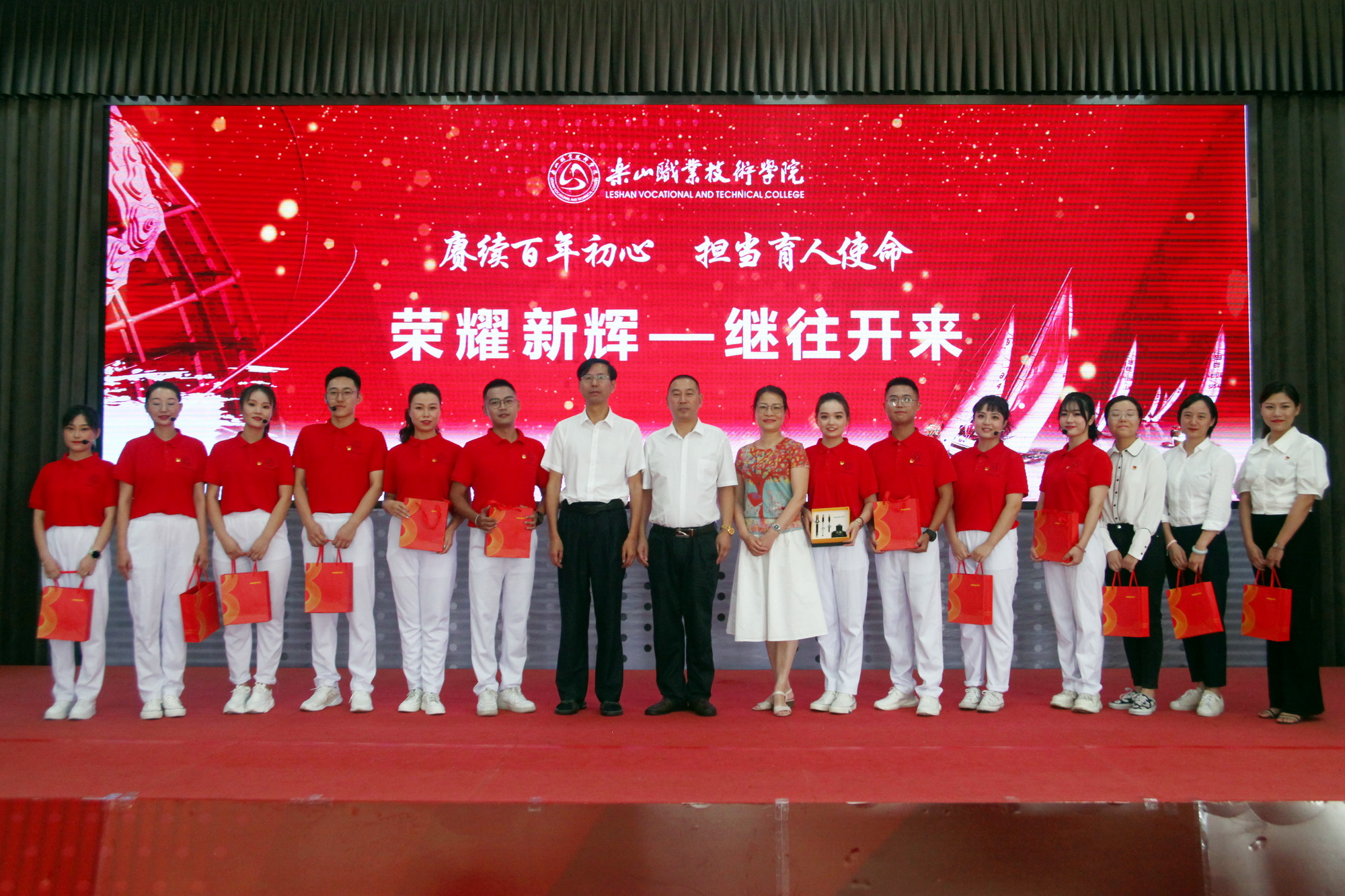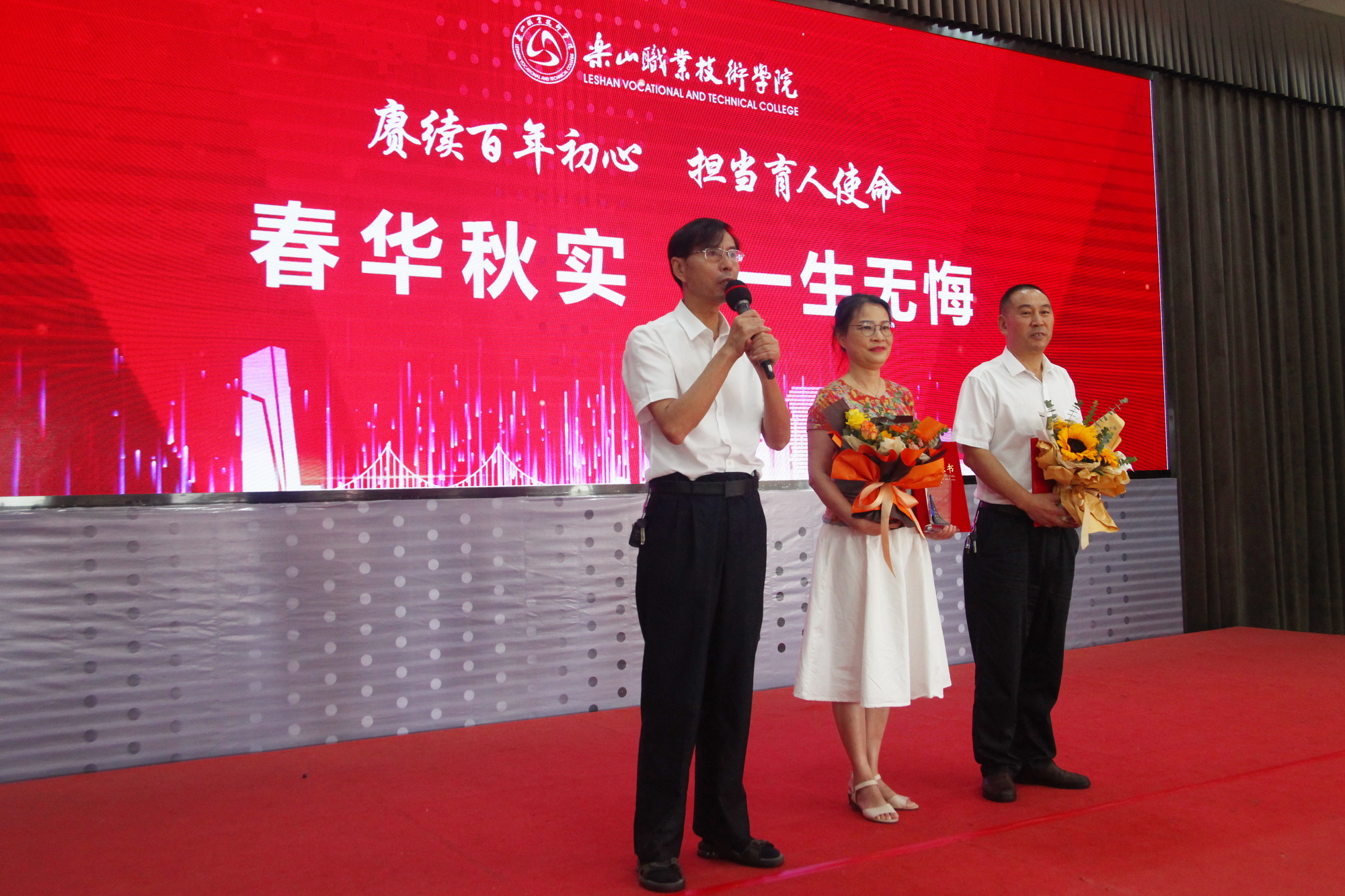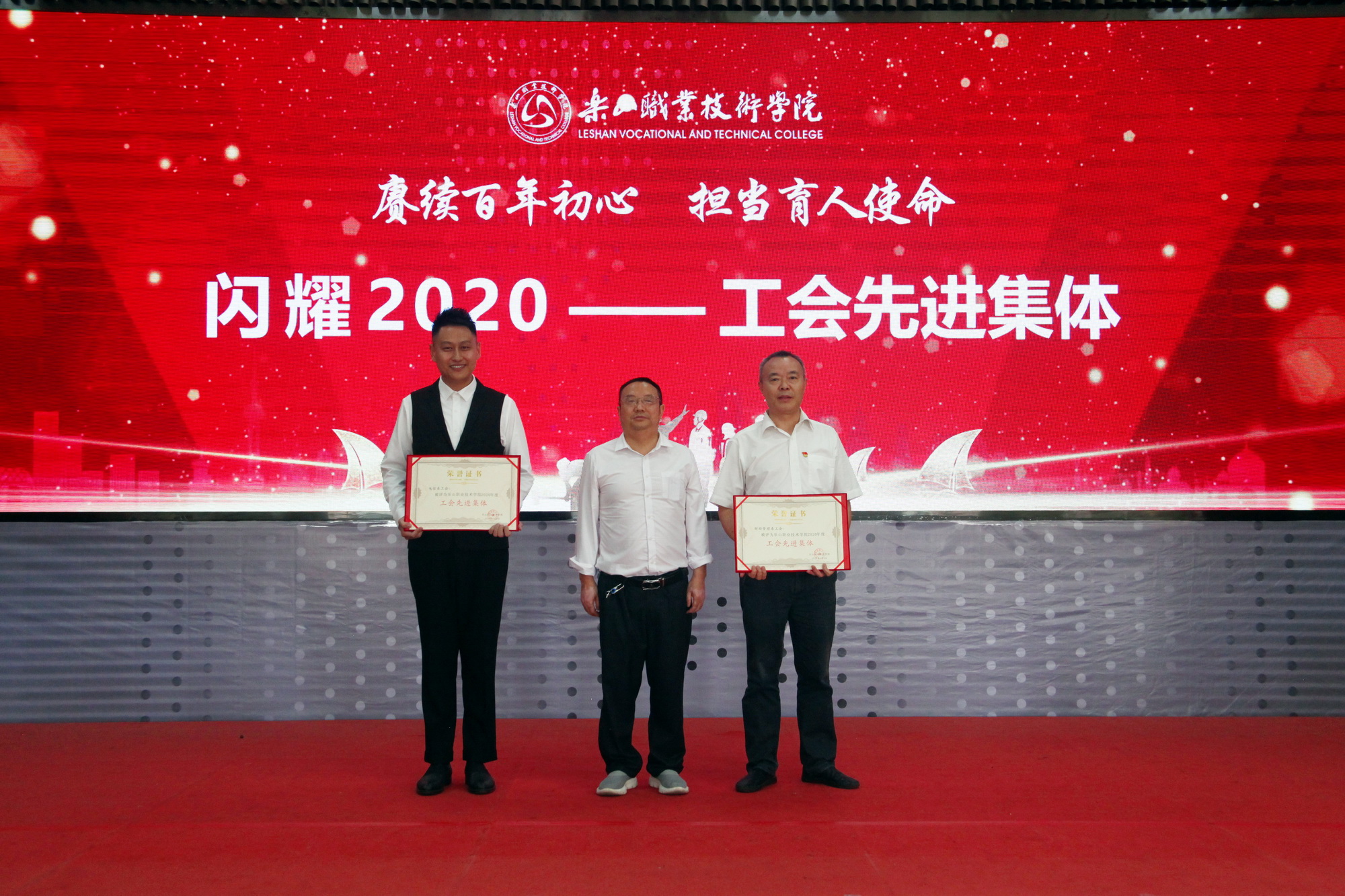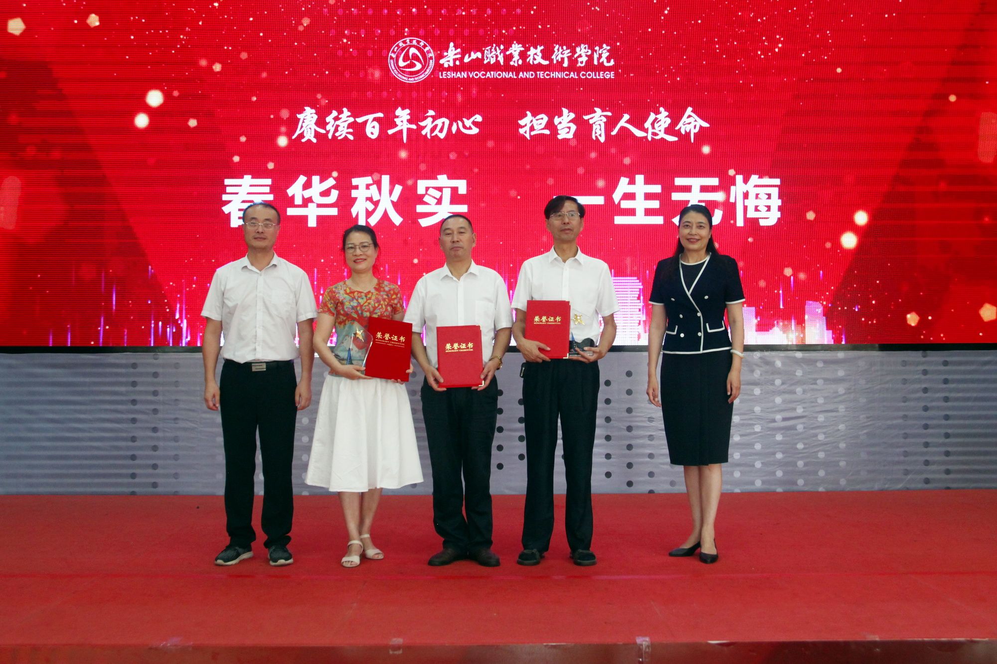 表彰环节,一共分为11个部分,分别为乐山市“优秀教育工作者 ”“优秀班主任”“优秀教师”,院级“先进工作者”、院级“优秀教师”、院级“优秀辅导员”、院级工会先进个人、院级工会先进集体,院级优秀教研室及优秀教研室主任、四川省高等学校省级“课程思政”示范课程、四川省高等学校省级“课程思政”示范专业、四川省高等学校省级“课程思政”示范教学团队、教育部习近平新时代中国特色社会主义思想大学习领航计划系列活动获奖团队。各奖项获奖代表依次上台接受学院领导颁奖。