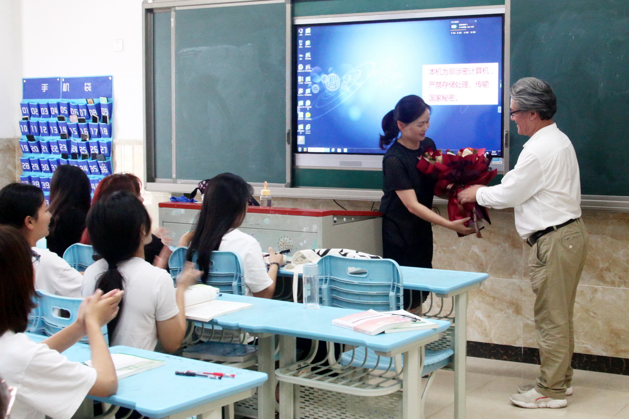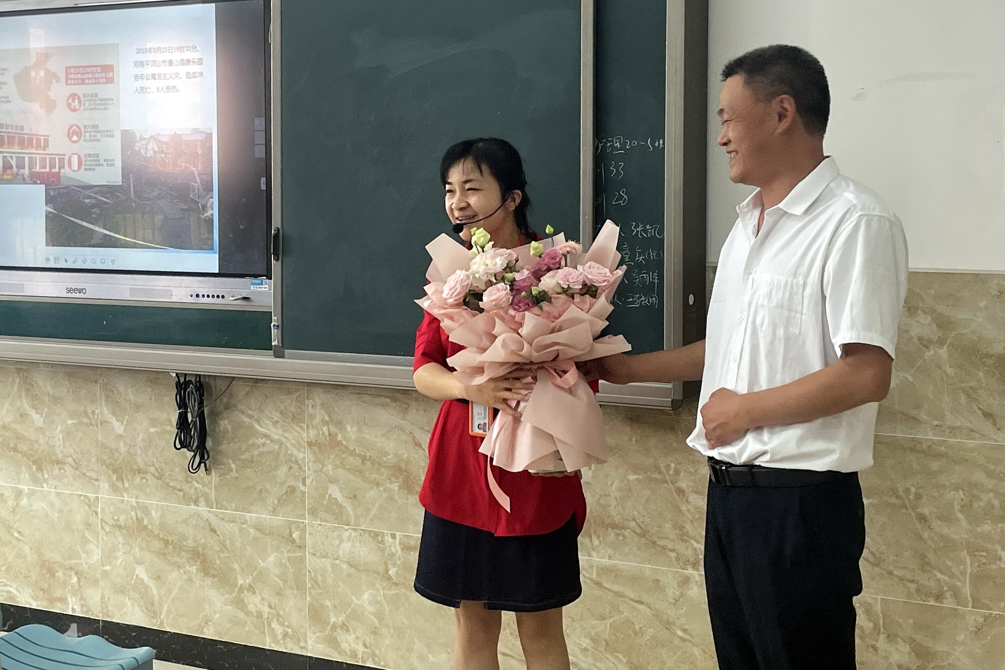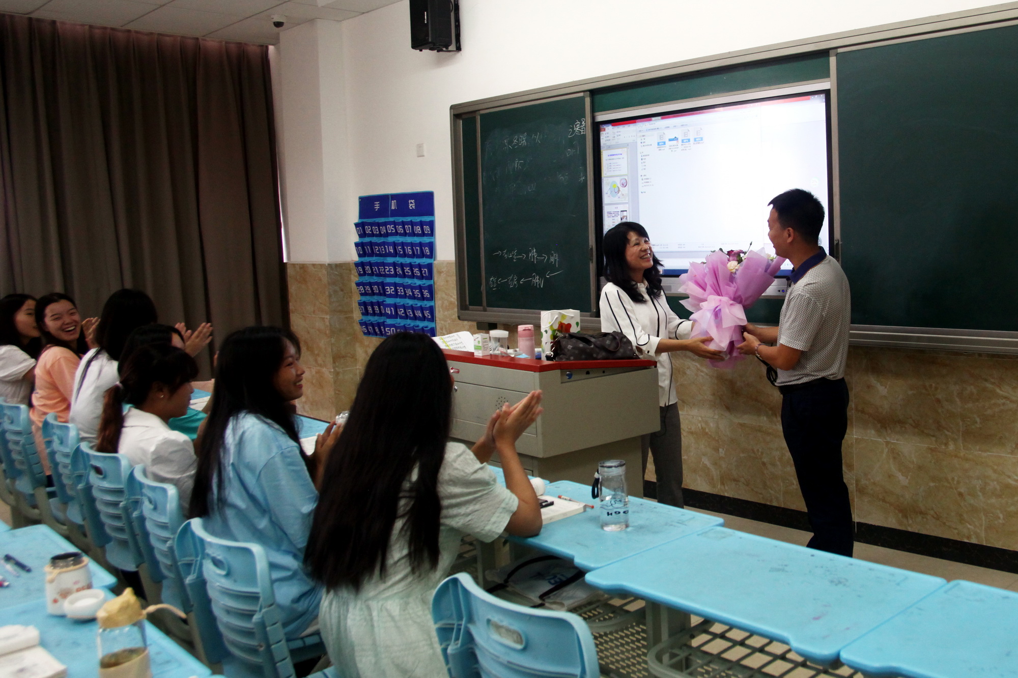 “鲍老师,您辛苦了,节日快乐!” 9月10日教师节一早,学院党委书记易群走进了4号实训楼306教室,将手里捧的一束鲜花递给了财经管理系青年教师鲍敏的手中。“好漂亮呀!没想到教师节当天能收到易书记送的鲜花,太惊喜了。”鲍老师开心地接过易书记送的鲜花,同学们也及时献上了祝福的掌声。