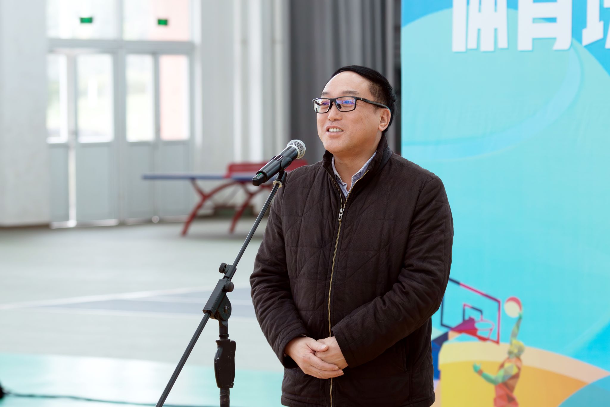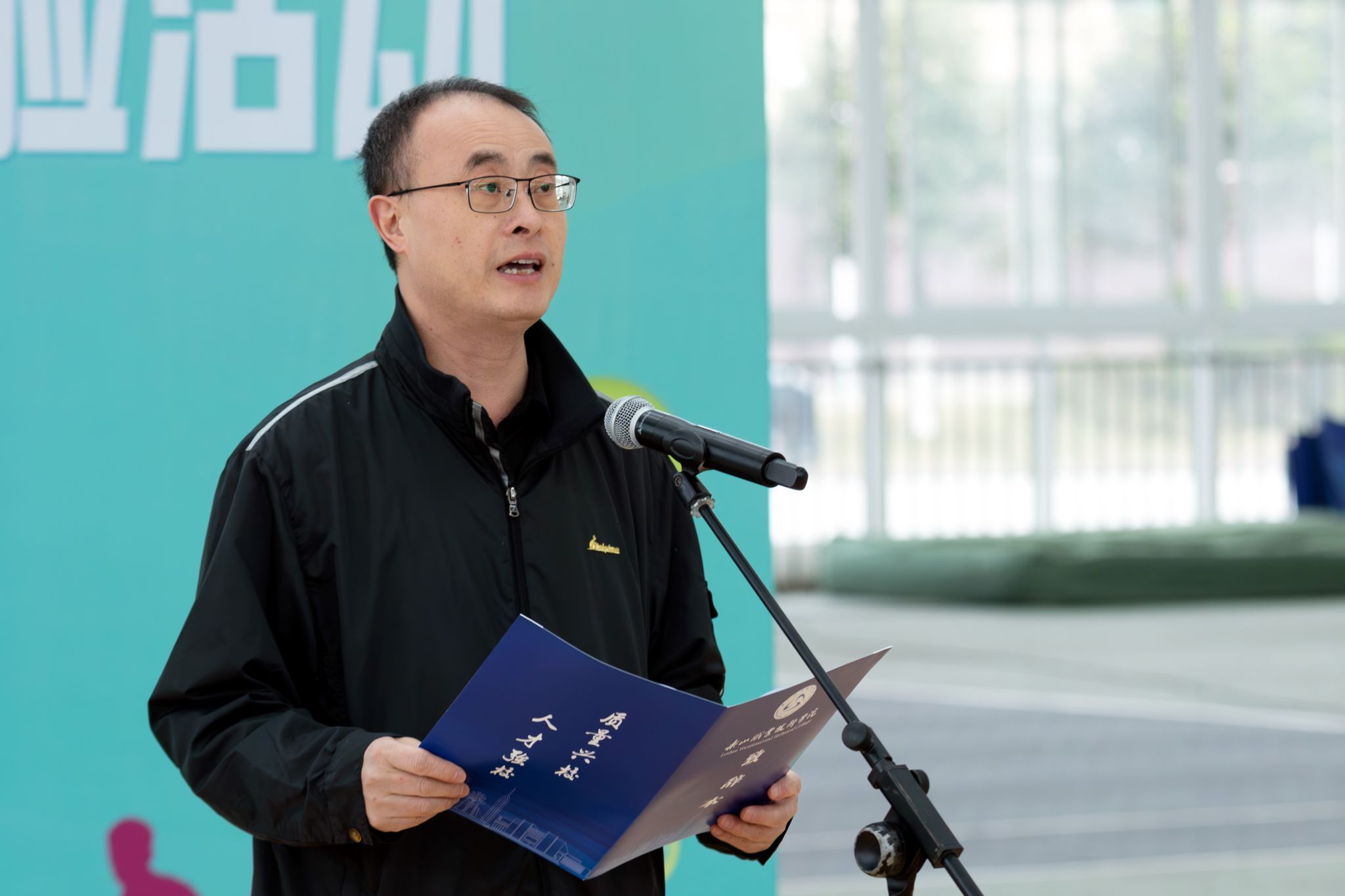 刘忠致辞,他表示“体育班级助理”试点活动是学校为提升管理水平、增强学生体质所采取的重要举措,“体育班级助理”将从素质教育学院休闲体育专业中选派,走进二级学院各班级,协助管理并引导同学们积极参与体育运动。同时,他希望同学们能通过网球体验活动,深入了解网球运动知识,亲身体验网球魅力。